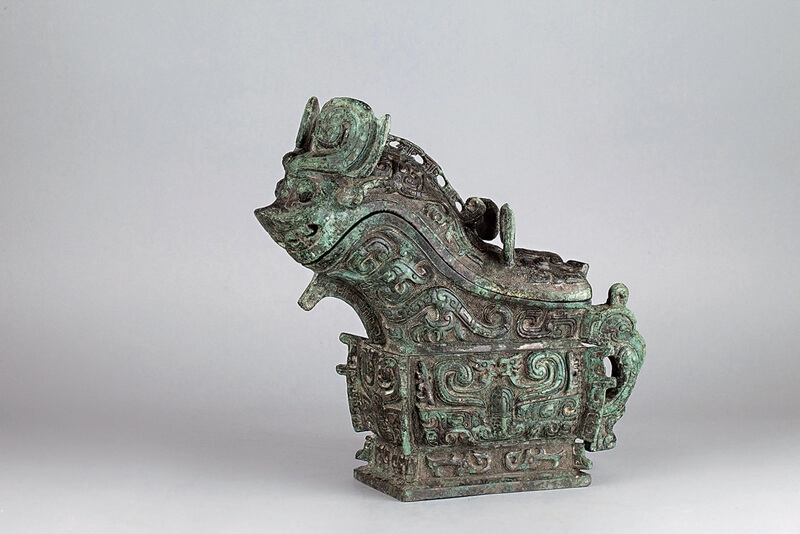 西周早期後段〈青銅器卷角獸面紋方座觥〉,高28公分。