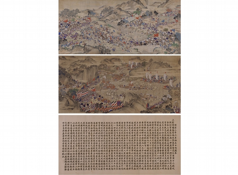 清代宮廷畫家繪〈平定太平天國戰圖〉,鏡心水墨、設色絹本、紙本,畫心120×297.5公分,120×293.5公分;上諭120×240公分。著錄:《曾國藩全集.奏稿》(同治二年),第207頁,嶽麓出社,1990年。張鐵寶〈清御敕湘淮軍平定太平天國戰圖考略〉,《湘淮人物與晚清社會》,社會科學文獻出版社,2011年。張弘星〈流散在海內外的兩組晚清宮廷戰圖考略〉,《故宮博物院院刊》總第94期,文物出版社,2001年。出版:《宋元明清中國古代書畫選集(二)》,第113~116頁,保利藝術博物館編。《第二屆北京中國文物藝術品國際博覽會展覽圖錄(貳)》,第204~209頁。展覽:保利藝術博物館2010年10月「宋元明清中國古代書畫大展(二)」。北京市文物局、北京日報報業集團、北京電視台主辦「第二屆北京中國文物藝術品國際博覽會」。來源:台灣資深藏家珍藏。