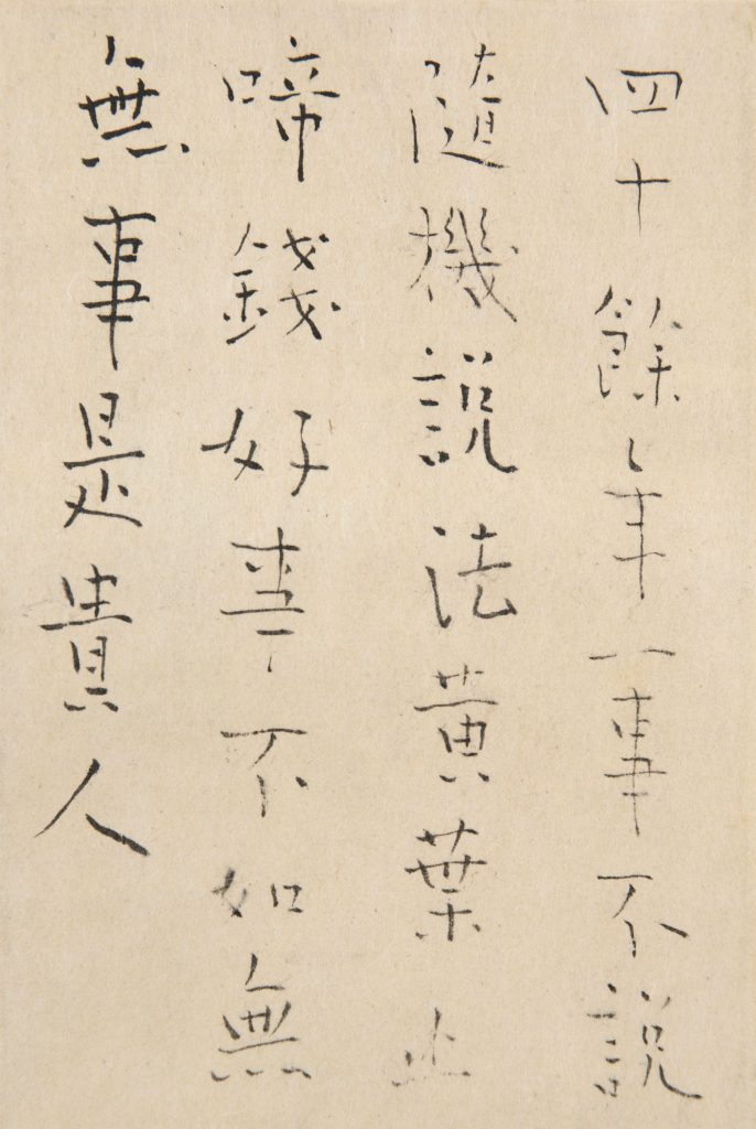 本期精選名作,依時代序列帶來三位書畫大師,二件文物。江戶時期禪僧良寬(1758-1831)《佛語四行》,藉由出自佛典或禪宗的詩偈法語「四十餘年一事不説。隨機說法黃葉止。啼錢好事不如無。無事是貴人。」表述禪思,句尾「無事是貴人」乃出自臨濟宗之祖臨濟義玄的語錄《臨濟錄》的名句。良寬書法的魅力在於樸素而富於變化的線條,其獨特細膩的情感與不拘一格的精神由此可見一斑。