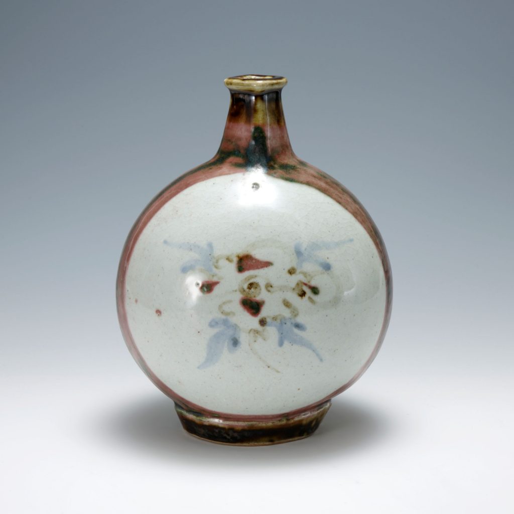 河井寬次郎(1890-1966)為知名的陶藝家,也精通詩詞和隨筆寫作,為柳宗悅「民藝運動」的重要實踐者。本件《草花圖扁壺》在白底上用辰砂、青花、鐵釉等,宛若隨意自在描畫的草花是寬次郎最具代表性的紋樣之一。