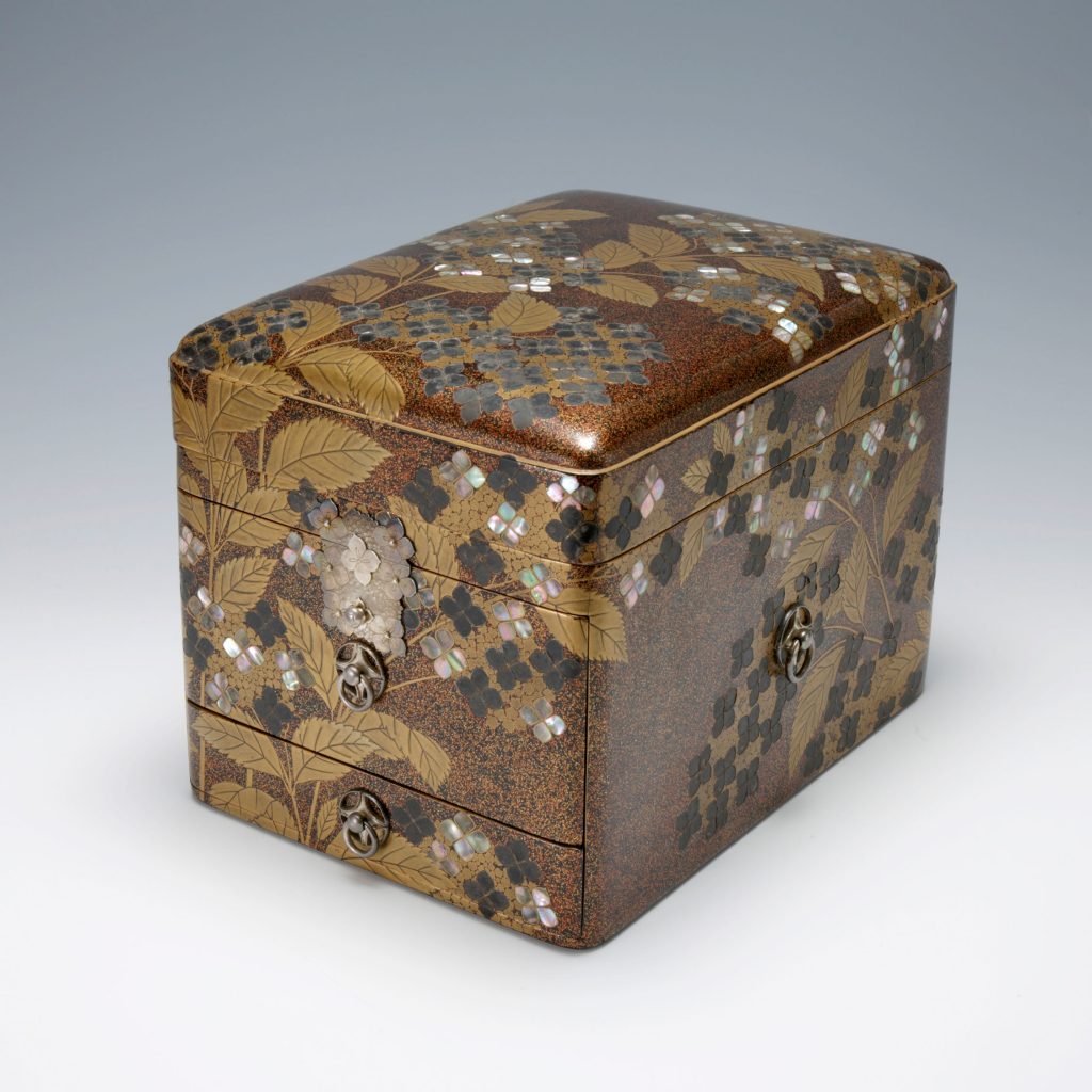 江戶時代初期《時代紫陽花十種香箱》則是分為上中下三層的十種香盒。連抽屜的金屬零件也為銀製,豪華至極的配置可見製作細緻程度之高。香箱的整體設計以紫陽花為主題,花瓣施有螺鈿。撇除因為年代久遠而能看到一些剝落的痕跡,本作通過使用日本常見品種的紫陽花作為裝飾,將日本近世初期的純正和風感覺完整地保留了下來。人們賦予了紫陽花各種各樣的花語,因其即使在久雨時節也能維持盛開狀態,有「忍耐力強」之意。此外,因為一朵花有很多花瓣,故亦有「家族團聚」吉祥寓意。