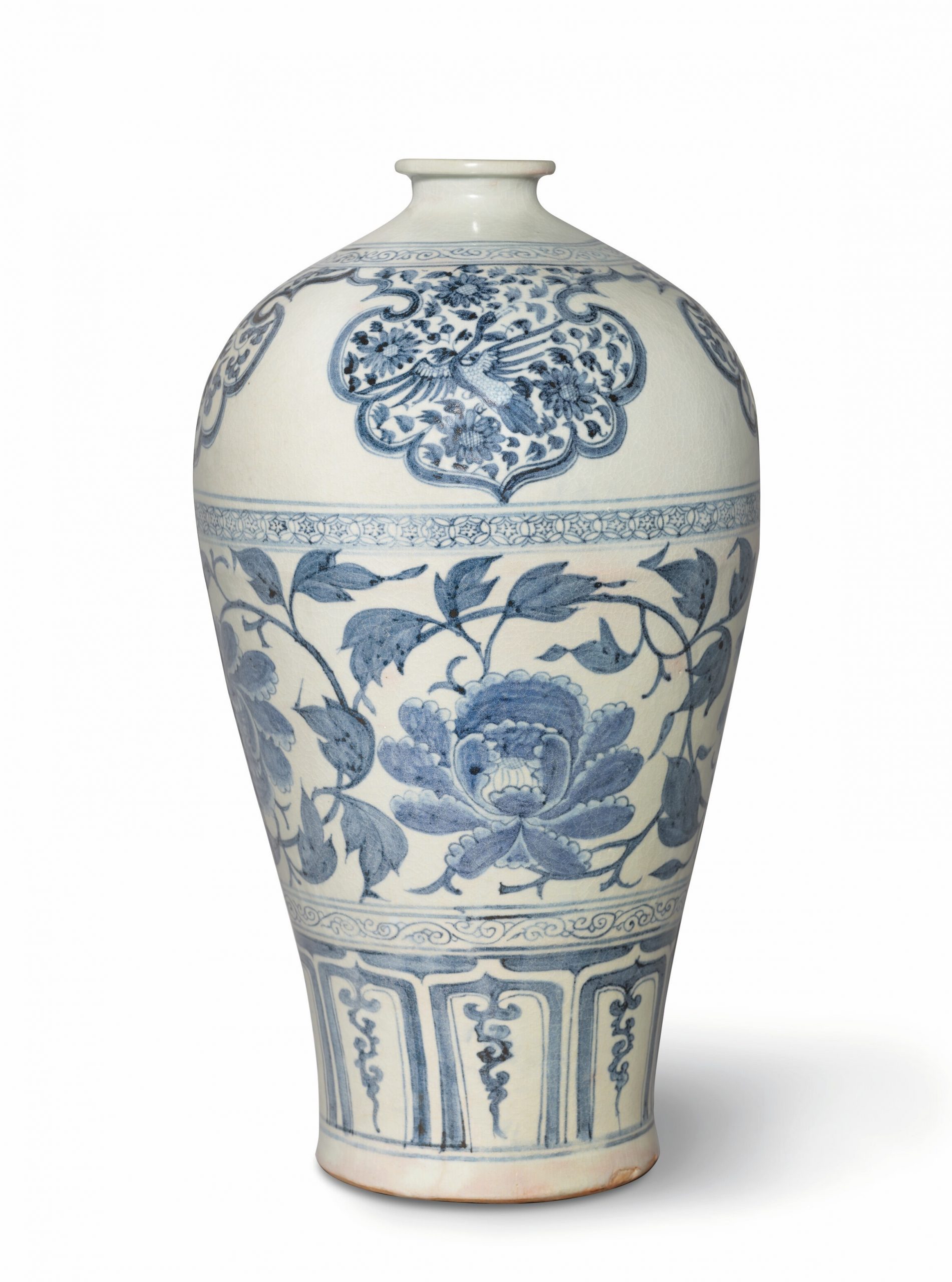 此外,本次有元代《青花花鳥雲肩纏枝牡丹紋梅瓶》小口折唇,短頸,豐肩,腹瘦長,矮圈足,足底無釉。通體繪青花紋飾,層次豐富。肩上繪卷草紋一周,肩部為四朵如意雲肩紋,雲肩內分別繪以菊花大雁紋及蓮紋,以下為金錢紋一周,腹部為纏枝牡丹紋,四朵盛開的牡丹與雲肩相對,或仰或覆,下以卷草紋,脛部為仰蓮紋。估價800萬至1200萬港元。