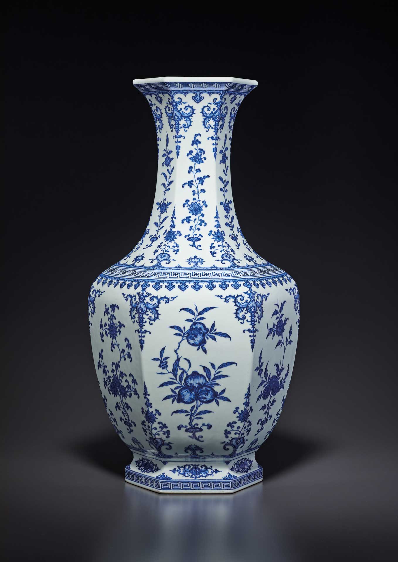 清乾隆《青花三多折技花果紋六方尊》造型敦碩,兼之釉下青花濃豔、畫工精妙,觀之氣派非凡。器身有折枝花果紋與靈芝紋,間繪西式纏枝圖案。以中西合璧的紋飾而言,本六方大尊的效果尤為出眾。此等佳妙之作應是為裝點宮廷而燒製的御瓷,北京紫禁城儲秀宮內有一對近似的六方尊,另一近似例為南京博物院收藏,松岡美術館藏中也有一例六方尊。拍場上亮相的近似例寥寥可數,香港佳士得曾於1998年4月27日拍出一例,其形狀、大小與紋飾俱與本拍品十分接近。