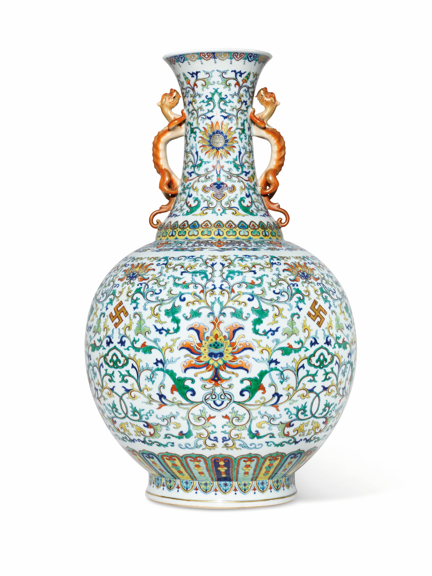 乍看之下,本拍品通體畫滿別具異域風情的勾蓮紋。但若細心玩味,便會發現當中串聯了許多如意雲頭紋。如意雲頭紋由靈芝紋演化而來,喻指「萬事如意」,是宮中習見的慶壽題材。就本拍品而言,如意雲頭紋除了環飾瓶口一匝,頸肩交接處也有其身影。再者,纏枝花卉紋中也有它的身影。此外,瓶身還以四個描金卍字為點綴。卍字這一佛教標識從印度傳入中土,武則天曾於公元693年譽之為「吉祥萬德之所集」。自此,卍字成為了歷代常見的禎祥符號。本季呈獻的典藏級《鬥彩萬福慶壽雙螭龍耳大瓶》兼具如意雲頭紋與卍字,進一步證實了此乃皇家賀禮之觀點。卓越的品質、巨大的尺寸和來源有緒的出處,足使本拍品成為任何中國瓷器鑑賞家收藏中的精品。