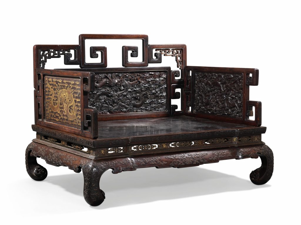 寶座是帝王權力及尊榮的象徵,一般與屏風、腳踏、香几及宮扇組成宮廷家具,放置在宮殿正中。據北京故宮博物院胡德生先生統計,北京故宮珍藏的寶座大約只有30件,而寶座與一般家具不一樣,舒適度並非最重要考量,其代表禮儀及權力的象徵才是首要功能。本件清18/19世紀《御製紫檀嵌黑漆描金硬木雲龍紋寶座》用料珍貴,構造繁複,背板及兩邊扶手板心都是一面嵌高浮雕龍紋紫檀木、一面嵌描金繪雲龍紋黑漆,堂皇華貴,盡顯皇權威嚴。寶座四腿及牙條上雕刻的洛可可風蕃蓮紋,與北京故宮博物院藏一件清中期紫檀寶座上之蓮紋風格非常相似,可資比較。漆金板心上之描金雲龍紋生動矯健,與美國明尼阿波利斯美術館藏一張彩漆三屏寶座上的龍紋風格接近。紫檀板心上浮雕的雲龍紋,也可與美國C. Ruxton及Audrey B. Love舊藏一張訂年18/19世紀的紫檀雕龍紋寶座比較,該件曾於2004年10月20日上拍紐約佳士得,拍品315號。