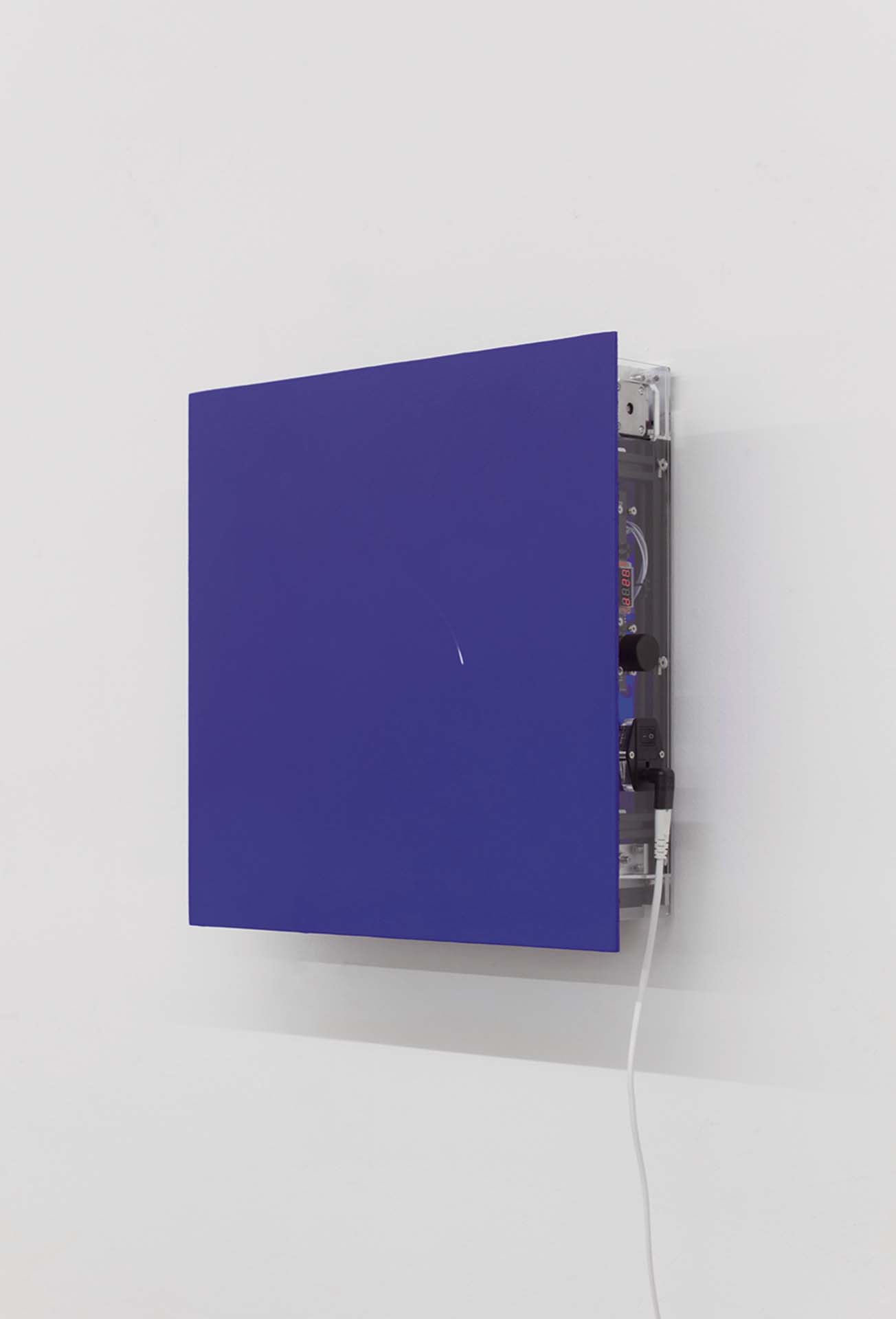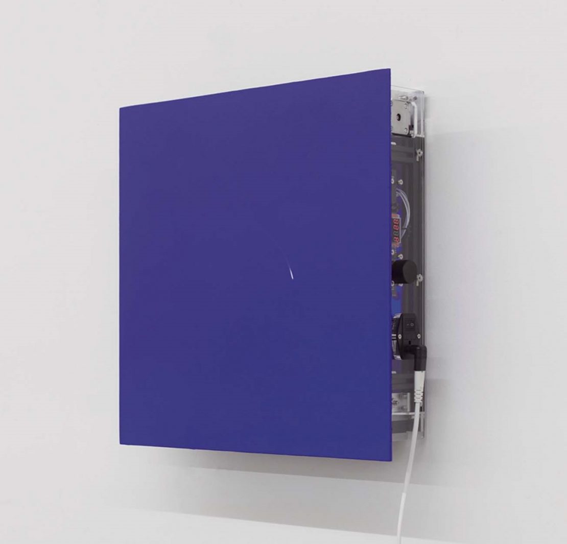 郝經芳與王令杰的作品往往和自然界的細微變化有關,主要媒介包括裝置、影像等。大自然的神祕與幽遠在他們的創作中顯現,同時具有科學的縝密邏輯,又富有情感及詩性,彷彿是一種二元的存在,在和諧的雙重邏輯裡相互對話。機械裝置作品《在一個萬物運動的宇宙中》呈現白色的點在單色的背景上緩慢的移動。白點持續的運動影響甚至改變了觀者的感知,當觀者注視著白點一段時間,便會產生視覺暫留現象,讓「觀看」的行為被突顯,藉由作品本身的變動塑造動態且有機的形象,進而使觀者感知的產生變動,除了從中意識到物質如何以構成,並沉浸式地感受作品所帶來的內心的顫動。那片全然而純粹的藍,彷彿是克萊因藍的延續,畫面的構成雖不涉及任何敘事,但卻巧妙地將人的生存狀態回到最初、最為直接的境地。