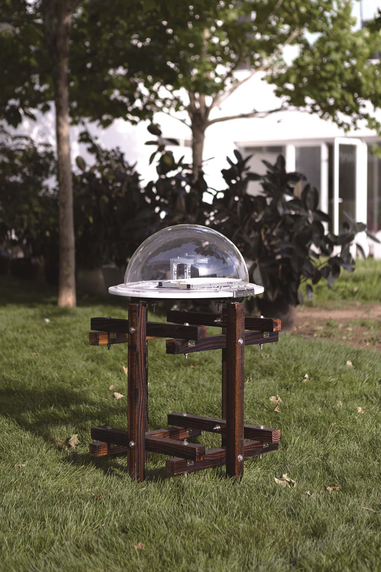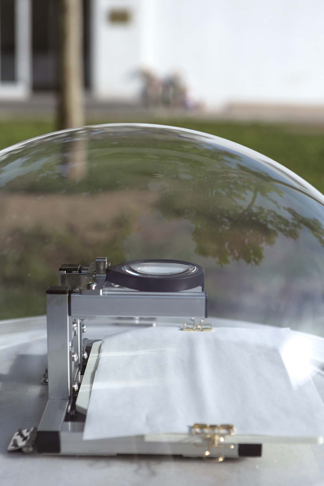 《Sun Drawing》則是以一個光學元件及熱感應紙組成的裝置,用來記錄太陽移動的軌跡,當陽光穿過透鏡匯聚在紙張上,太陽本身的熱能便會在紙上留下痕跡,天氣及四周的環境變化也會同時被紀在紙上,成為作品的變因。《Sun Drawing》,充分體現了郝經芳及王令杰兩人的性格,他們既深入的應用了光學及機械裝置,又創造出具有美學及感性認知的空間。一幅幅記錄太陽軌跡的作品在延伸出作者性與時間性的探討,當半圓球體的機械裝置完成後,創作者便隱身,接續則交由大自然來完成作品。此外,多重的時間性在展場疊合,太陽運行的時間、每一件作品間不同的時間及觀看的當下,三者在展場中交會在同一個點上。
