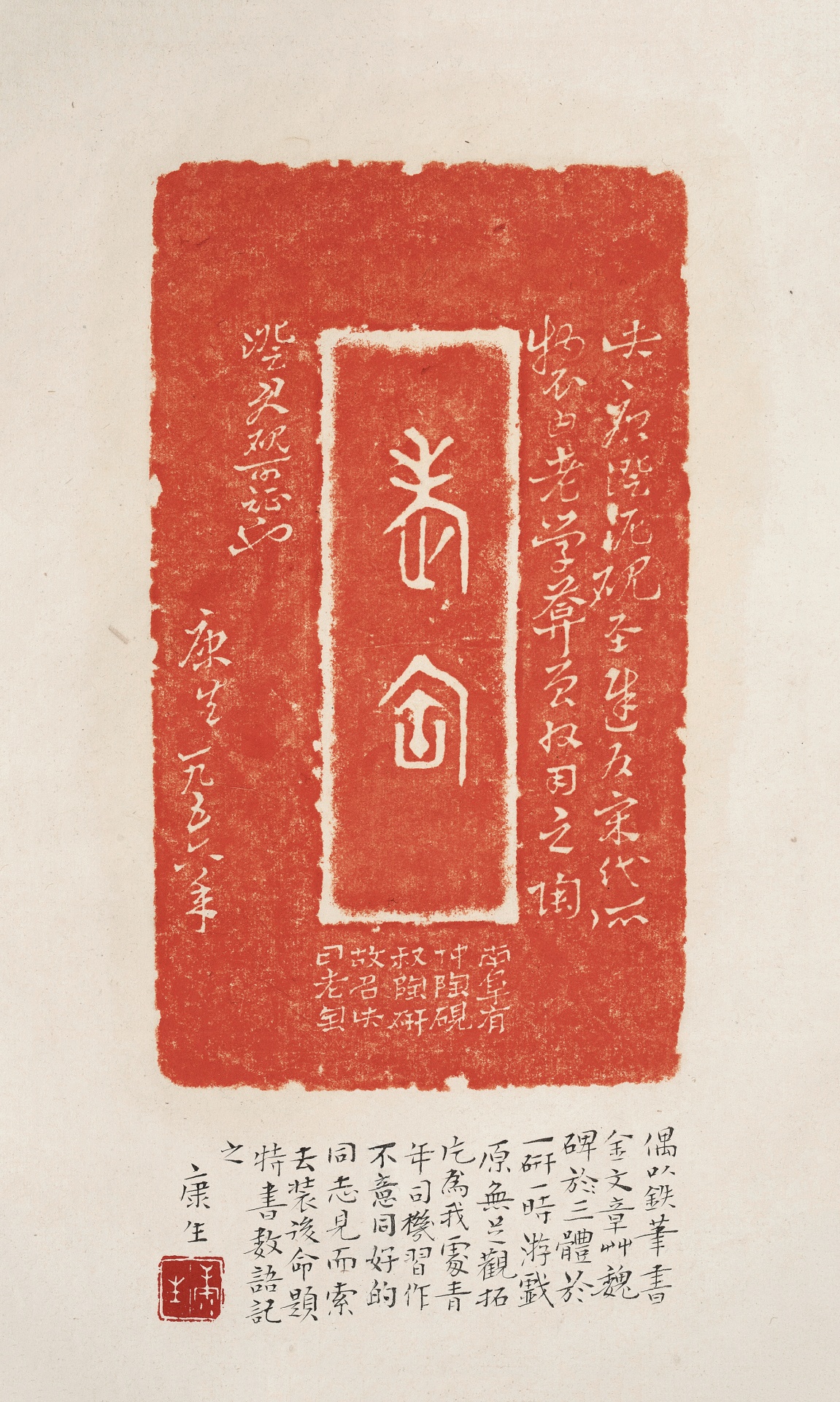 康生一生對其膠東前輩高鳳翰的金石書畫非常推崇。康生喜歡左手作書,其實也是受高鳳翰的影響。高鳳翰嗜硯,藏硯逾千,皆自為銘詞手鐫之,著有《硯史》。康生對硯也有濃厚興趣,也經常自鐫銘文,這應與高鳳翰影響有很大的關係。本專題第一件的康生題自刻朱拓「老匋」硯,此硯集金文、章草、魏碑三體書法於一身,鐵筆鐫之,風骨清勁,個性極強,可見康生真草隸篆皆擅,而題跋中說是「一時遊戲」,實乃謙辭。
