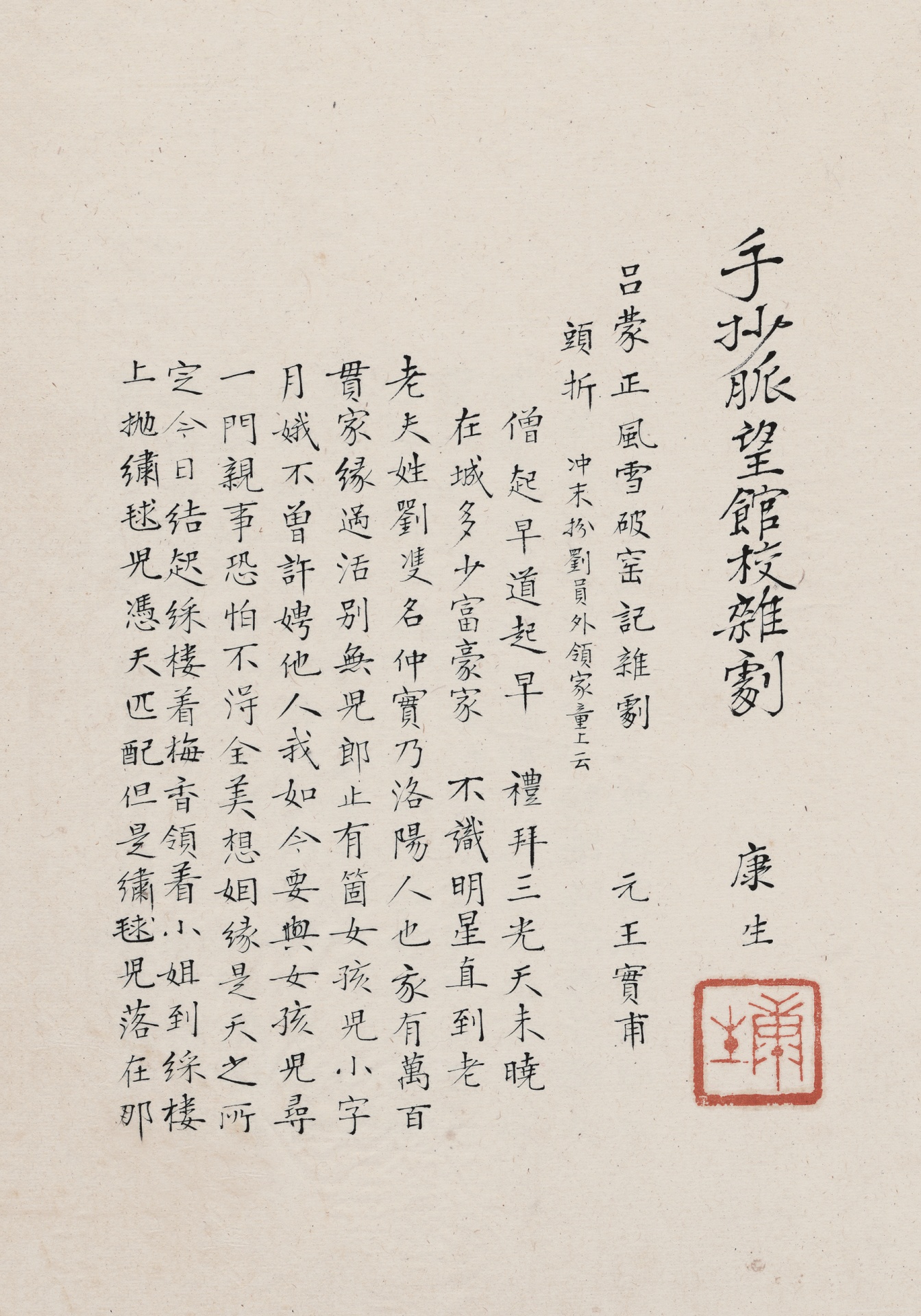另有康生同時期手抄的同樣來源於《古今雜劇》中的《蘇子瞻風雪貶黃州》抄本24頁,近萬字。值得一提的是,他判斷原本中未落款的《貶黃州》抄本應為趙清常親筆,由此可知,康生於抄錄外,更著意於版本及流傳方面的研究。