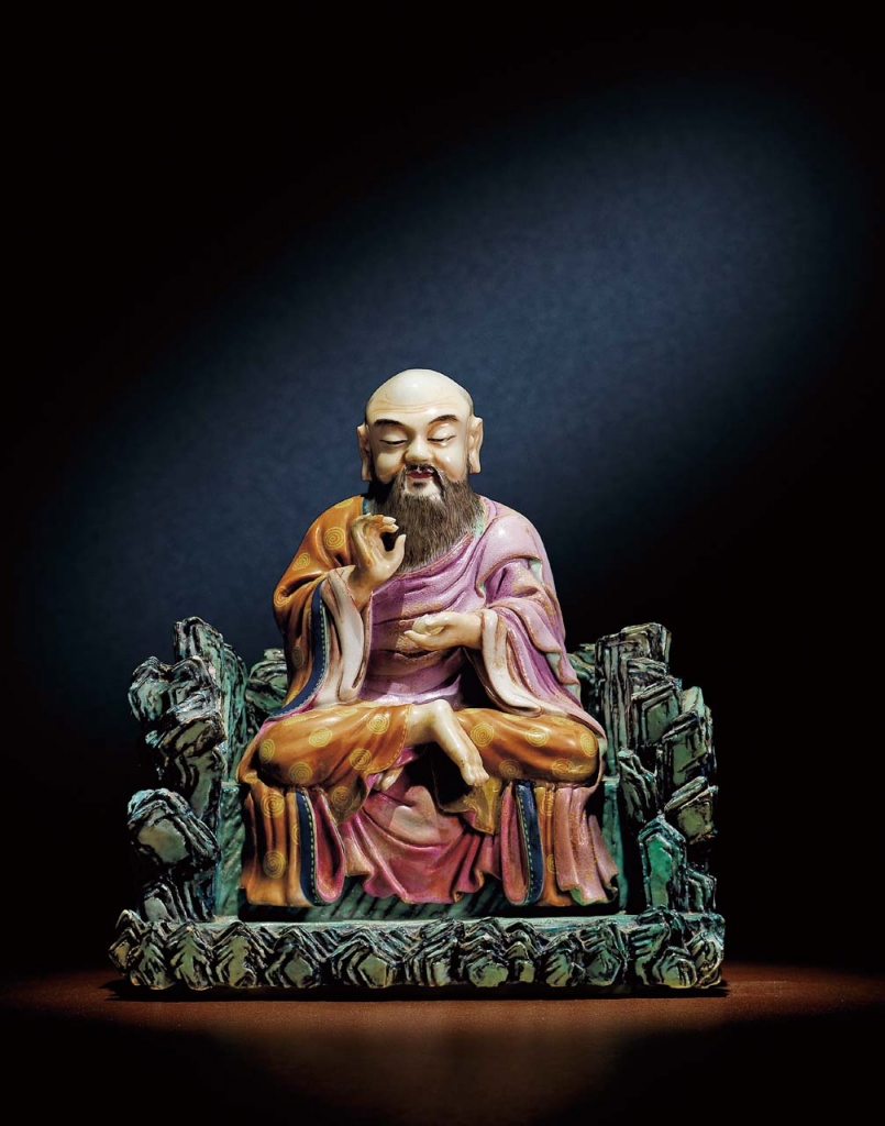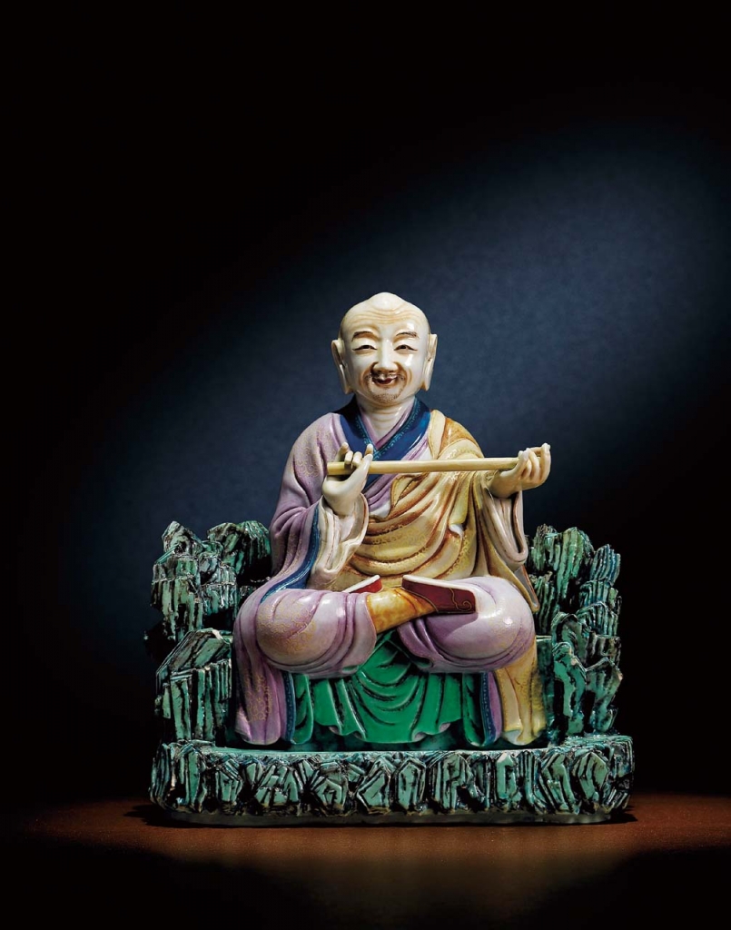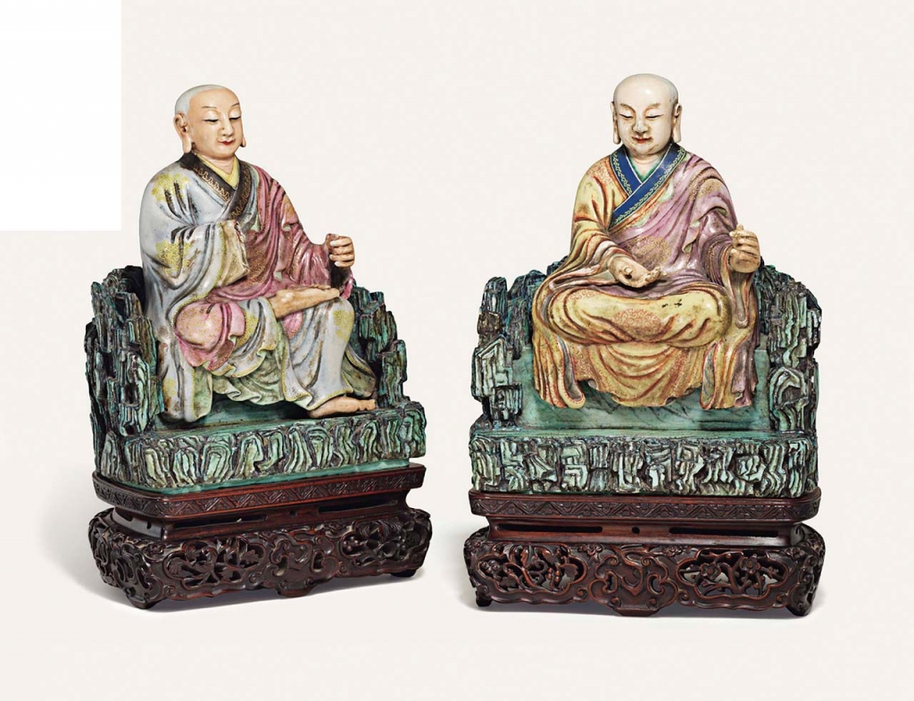 查閱相關資料,除了上述之二尊羅漢坐像,拍賣市場還見有北京翰海2009年秋季拍賣會之清乾隆〈粉彩彌勒佛〉,編號3476。倫敦佳士得2015年秋季拍賣會之清18世紀〈粉彩羅漢〉兩尊,編號304,另外收藏家趙從衍《華光草堂珍藏清代瓷器》一書著錄一尊乾隆〈粉彩羅漢塑像〉,黑白圖版119,亦與本拍品相類。