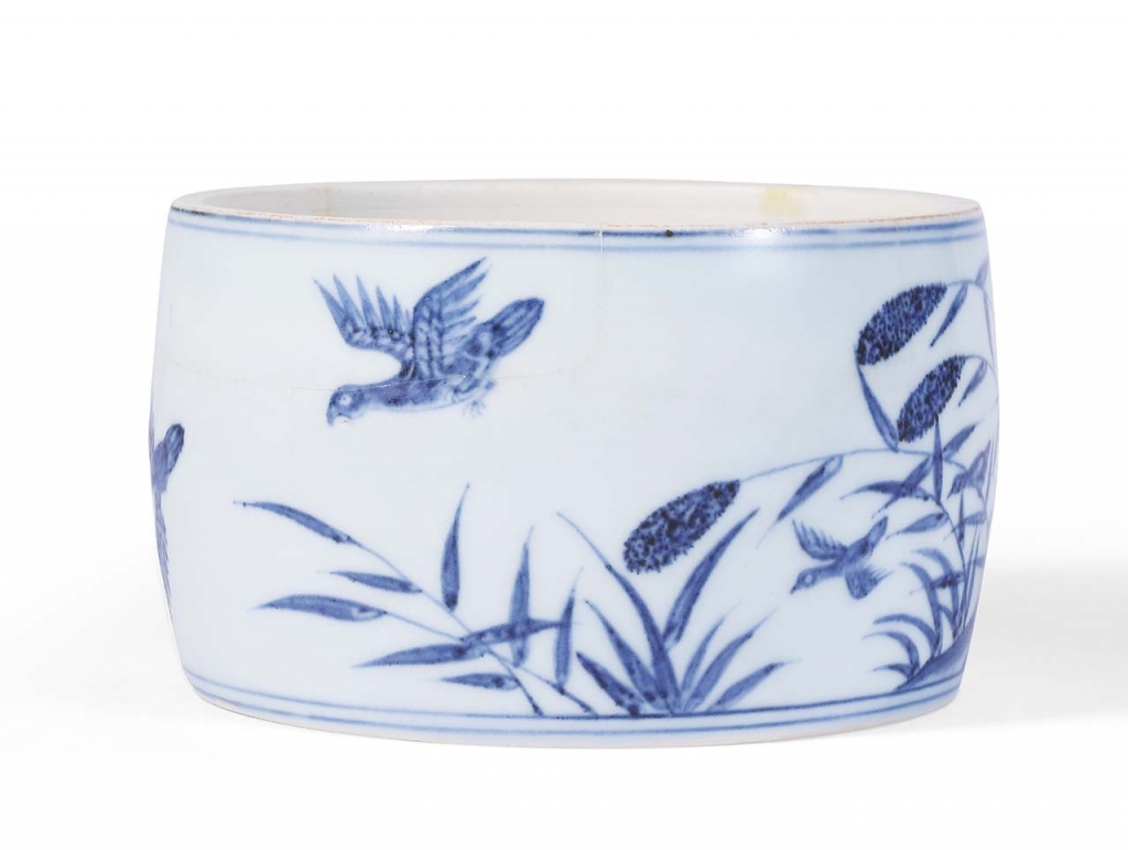 本品圓筒狀,深弧腹,淺圈足。胎體厚重,胎質細膩,青花發色濃豔欲滴,青中泛紫,著色濃重處還帶有蘇麻離青料的鐵鏽斑,時代特徵明顯。明清時期,朝廷逐漸恢復宮廷繪畫機構,院體畫又有了一定的發展。明代沒有專門的畫院,但有宮廷畫家,多取法宋朝院畫,這一時期主要以戴進、吳偉、林良最為突出,林良是明代院體花鳥畫的代表人物,另有邊景昭、孫隆、呂紀等。拍品器外壁一周通景繪蘆雁圖紋飾。蘆雁或引吭高歌,或俯衝覓食,姿態各異,栩栩如生。北京故宮博物院藏一件林良作〈灌木集禽圖〉,構圖就與本品極為相似,由此或可推斷,此類花鳥圖案式蟋蟀罐參照明初院體花鳥派繪畫,或為宮廷畫匠直供畫樣所製,亦未可知。