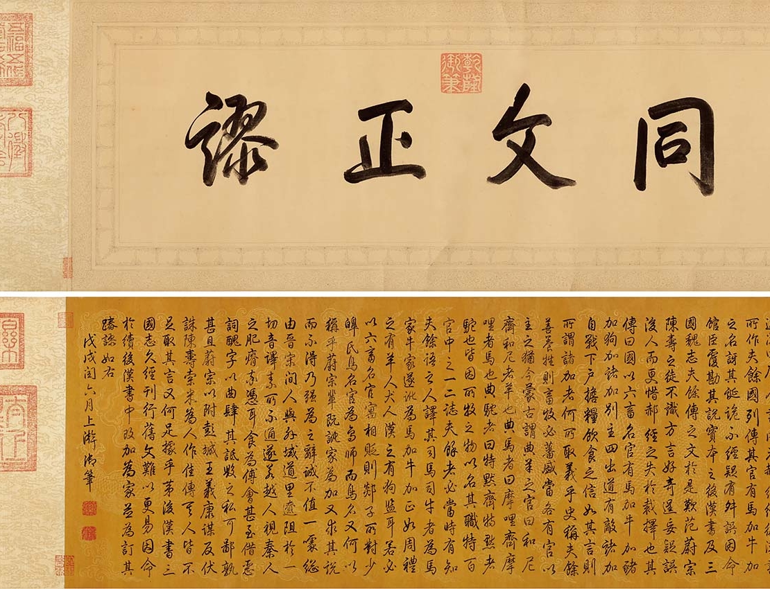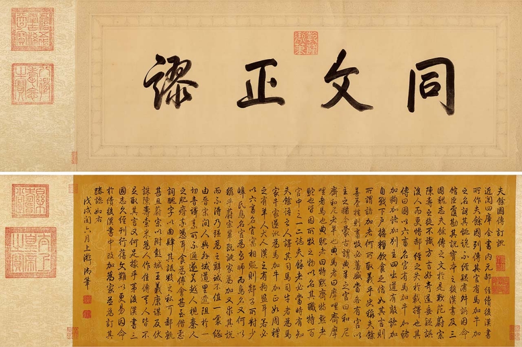 本卷所保留的,是清代標準的宮廷裝潢樣式,而又有清晰準確的記錄,被保留在造辦處如意館的檔案當中。尤其是本卷的織錦包首,為葡灰錦群地三多(佛手、石榴、蓮蓬)紋織金錦包首,這與北京故宮博物院藏的〈御筆千尺雪〉(包首三多紋為佛手、石榴、菊花)等其他乾隆帝御筆的手卷幾乎一致。本卷用紙為宮製佛黃描金龍紋蠟箋,這種用紙在現在很多公開發表及館藏的圖典中都能找到,引首的紙張選用乾隆時期特製的專用引首紙,帶有勾蓮卷葉紋花邊,均為手繪,簽條用古銅色紙,用正楷書寫篇名,配上玉別子,隸書填金陰刻,上為「乾隆御筆」、下為本手卷的名稱「御筆夫餘國傳訂訛」,從形制到裝潢,俱為乾隆內府的典範。該卷著錄於:清乾隆四十二年(1777)《欽定滿洲源流考》卷一,武英殿刻本;清乾隆四十四年(1779)《欽定盛京通志卷》卷十,清刻本;清乾隆五十一年(1786)《御製文二集》卷二十五,清刻本;乾隆五十八年(1793)《石渠寶笈續編》寧壽宮藏六,清抄本;清張鳳台編撰《長白匯徵錄》,吉林文史出版社,1987,頁118-120;乾隆四十三年(1778)各作成做活計清檔.如意館,《清宮內務府造辦處檔案總匯》第41冊,人民出版社,2005,頁805。