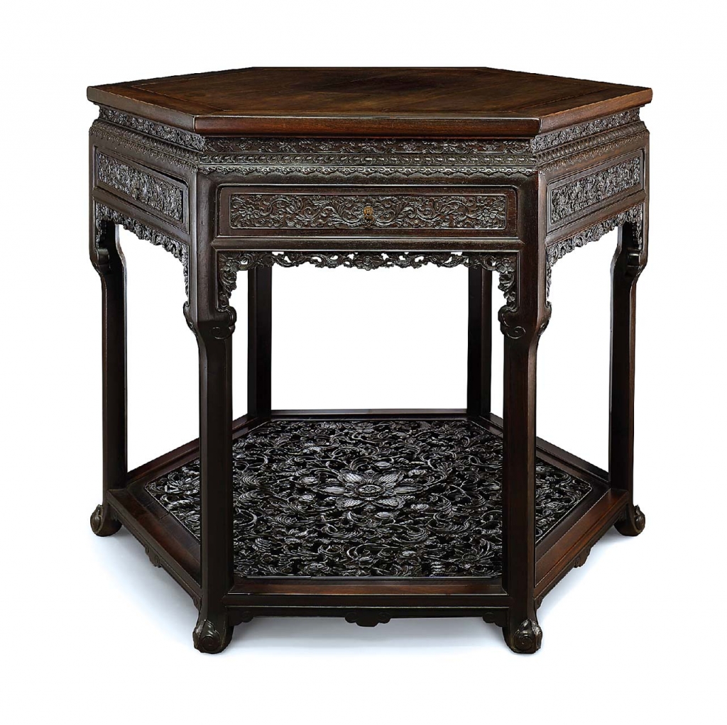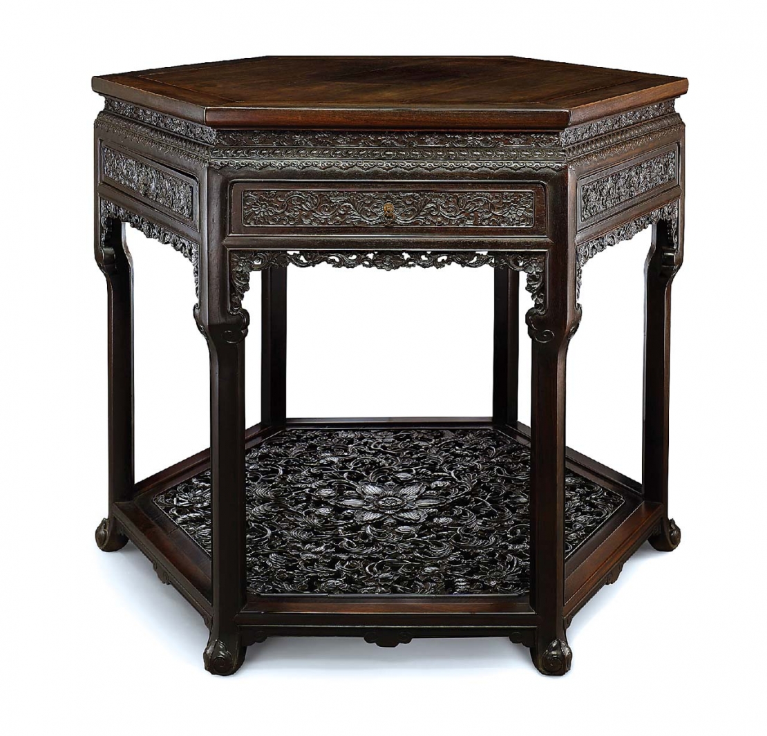 「摛翰藻─文房雅器」共推出68件拍品,件數成交率75%,總成交金額1億1619萬6250元,締造2件千萬拍品,逾百萬者有16件,其中的古典家具木器系列成績傲人,囊括千萬冠亞雙雄,以清乾隆〈紫檀西蕃蓮紋展腿式六方桌〉領銜全場,尺寸碩大且造型獨特,為目前所僅見之典型清宮御用器,後作為外銷物品,輾轉於外域,曾經日本細川護立家族遞藏,估價1600萬至2000萬元,最終成交價2065萬元。第二高價為明17世紀〈黃花梨圓角櫃一對連原底座〉成交價1825萬元。前12高價榜,除第三高價為晚商〈青銅鴞卣〉成交價925萬元、第七高價為清乾隆十一年(1746)〈御用芙蓉石五駿圖「琴書道趣生」寶璽〉成交價500萬元,黃花梨家具包辦其他10件,皆逾成交價300萬元以上,延續著春季以來的熱潮。