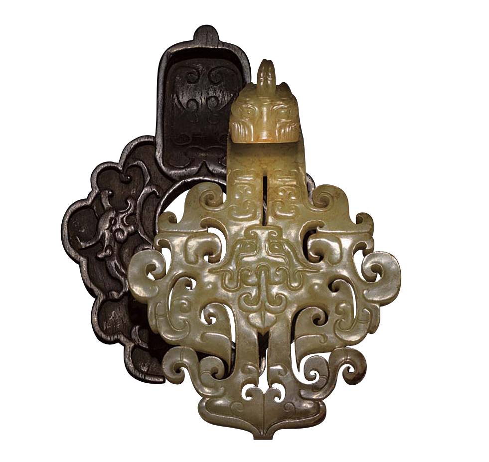 九件高古玉上起新石器時代,下至西漢,造型各異,當中西漢〈黃玉帶鉤〉以淺黃玉製成,色調雅淡,玉質溫潤。鈎狀如盾,鏤雕卷雲紋飾布局規整,中心淺浮雕獸面紋,頸飾C形紋兩列,頂設獸首形鈎頭,獸角後翻形成小圈。鈎體背面上方刻一長頸鳥,仰首翻腰,長尾繞拽。圓鈕中心陰刻渦紋。因為保存狀況甚好,風格典雅,且有明確的收藏來源,以240萬英鎊落槌,290萬2500英鎊成交,是近八年來第一次有高古玉躋身工藝品前十大。