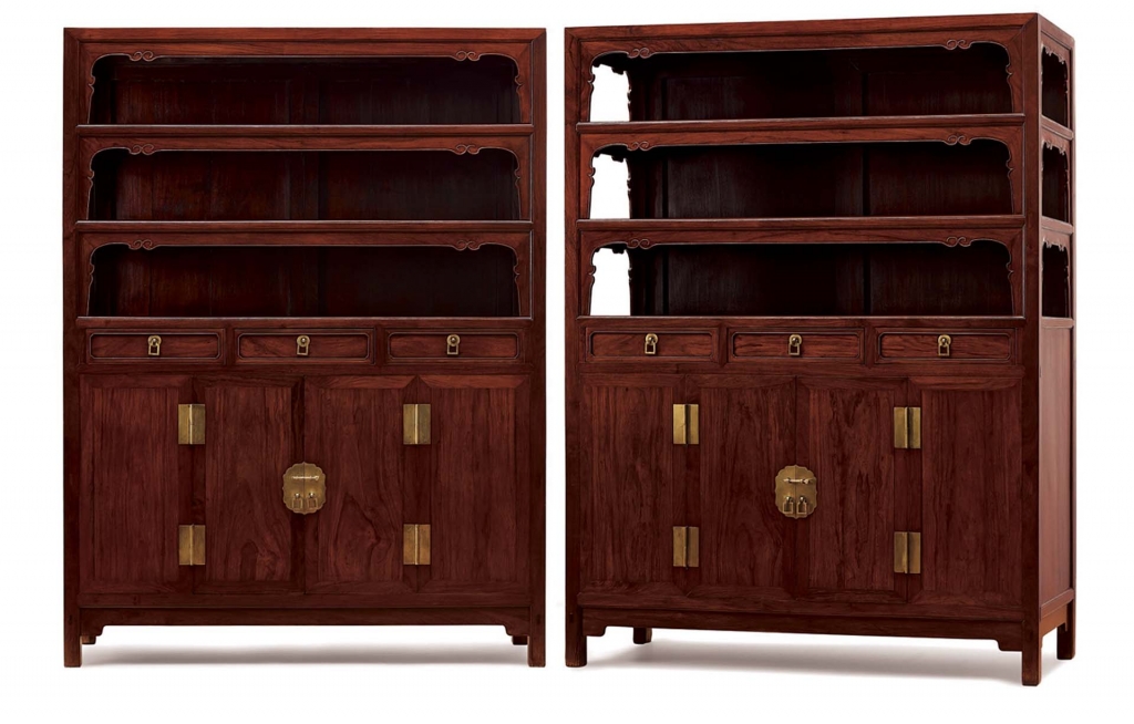 萬曆櫃為明式家具中之特別種類,因流行於萬曆年間,故名。萬曆櫃結合櫥及櫃之結構,既實用也風雅,深得文人士大夫青睞,常見於文士書齋,或並排左右,或各倚一牆,講求視覺對稱,以合中式屋室陳設之道。櫃頂層格可置書卷,可陳古玩,抽屜則收納筆墨紙硯,下方門櫃牢固,存放待客所用之茶具等易損什物尤宜。萬曆櫃頂設多層格者,稀見無多,而考當時木刻版畫亦鮮見其例,故知珍罕。
