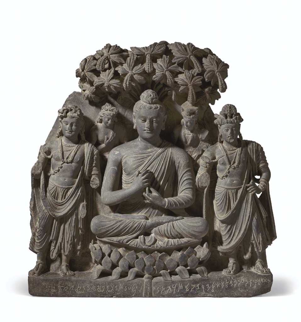 佛教造像及相關工藝品因應時代及地區的不同,常有不一樣的樣貌及風格。再加上其宗教因素,也導致佛教造像及相關工藝品一直是中國及歐美拍賣市場相當受歡迎的門類。犍陀羅風格的佛教造像特徵在於其內含希臘文化的影子,此時造像的五官相當立體,且隱約有著西方人的特徵,造像講究人體的肌肉線條,與後來中國風格的佛教造像有很明顯的不同。犍陀羅應為3至4世紀〈灰片岩浮雕釋迦牟尼佛及菩薩像〉即富犍陀羅風格的特徵。