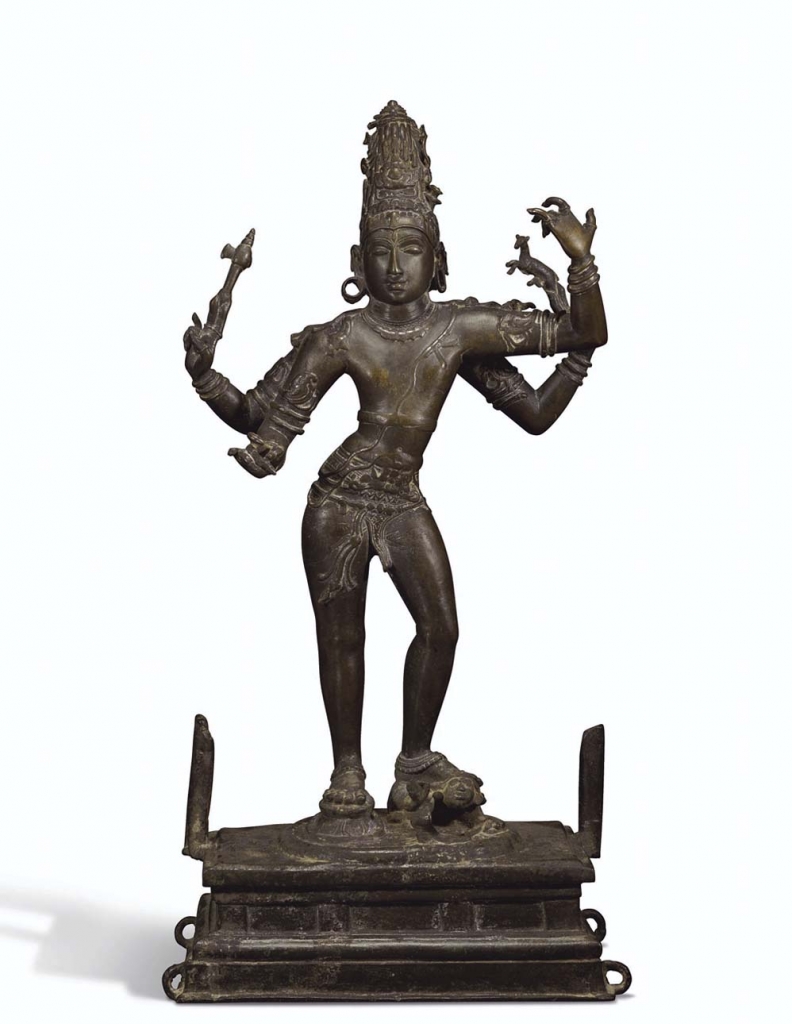是次專場中的拍品皆出於詹姆斯及瑪麗蓮.阿爾斯多夫伉儷(James and Marilynn Alsdorf),兩人皆對藝術收藏充滿熱情,其中又以印度及喜馬拉雅藝術尤甚。這件濕婆像高82.3公分,左膝前傾,呈三屈式,腳踏侏儒。腰著托蒂,瓔珞成串,臂腕佩釧,四手舒展,分持斧頭、母鹿。雙頰飽滿,眉清目秀,耳長垂璫,神情莊重。攢髮盤髻,寶冠成塔,聚新月、長蛇、聖草。風姿綽約,韻致靈動。