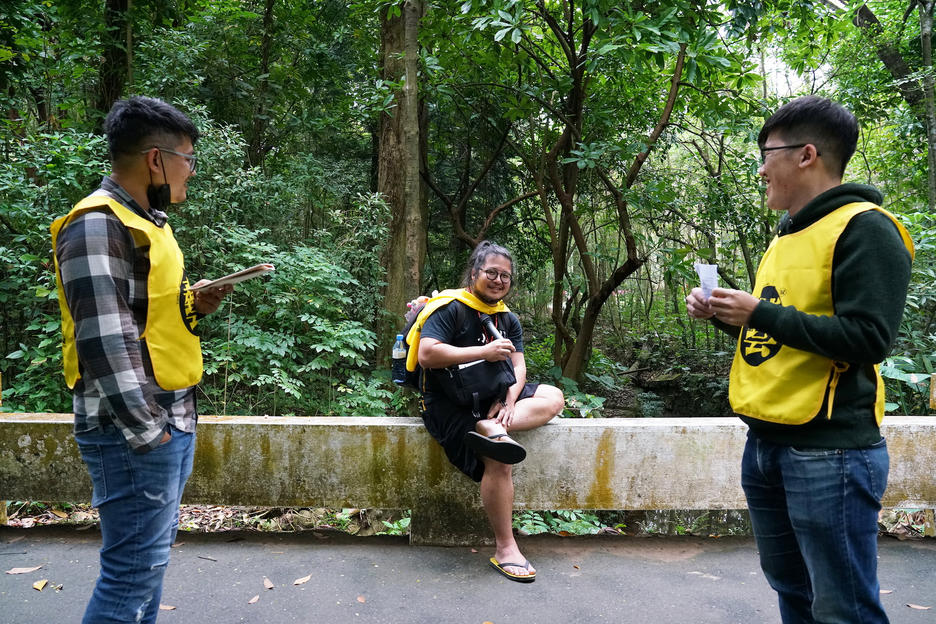 駐村的兩位藝術家,在公園裡向對方喊著自己知道的嘉義冷知識,每問一題就遠離收音麥克風幾步,聲音越來越遠,連本來的對話也融入在環境之中。這是主持人與駐村藝術家邱雍晉與蔡咅璟三人之間的「駐村交流斬」。