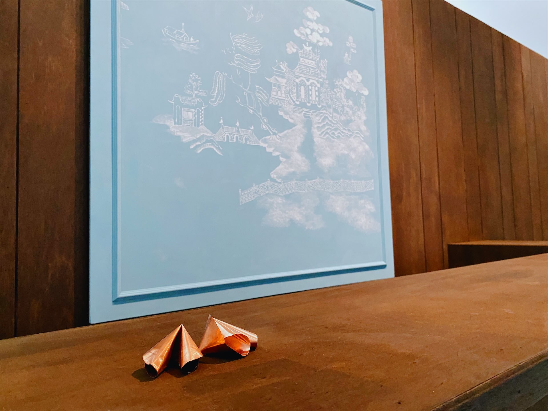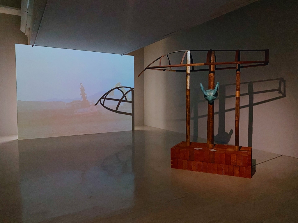 劉紀彤《兩河之間》以烏山頭水庫作為取樣,邀請觀眾望向水面之下、風景背後簡化的消失,以及技術物如何改變水和人之間的關係。藝術家勘察周圍村莊找到祭祀場域、紀念銅像,將其事件、資訊各自解體再共構,並挪用日本童話象徵符號,重新翻閱現代化下的神話與傳說。
