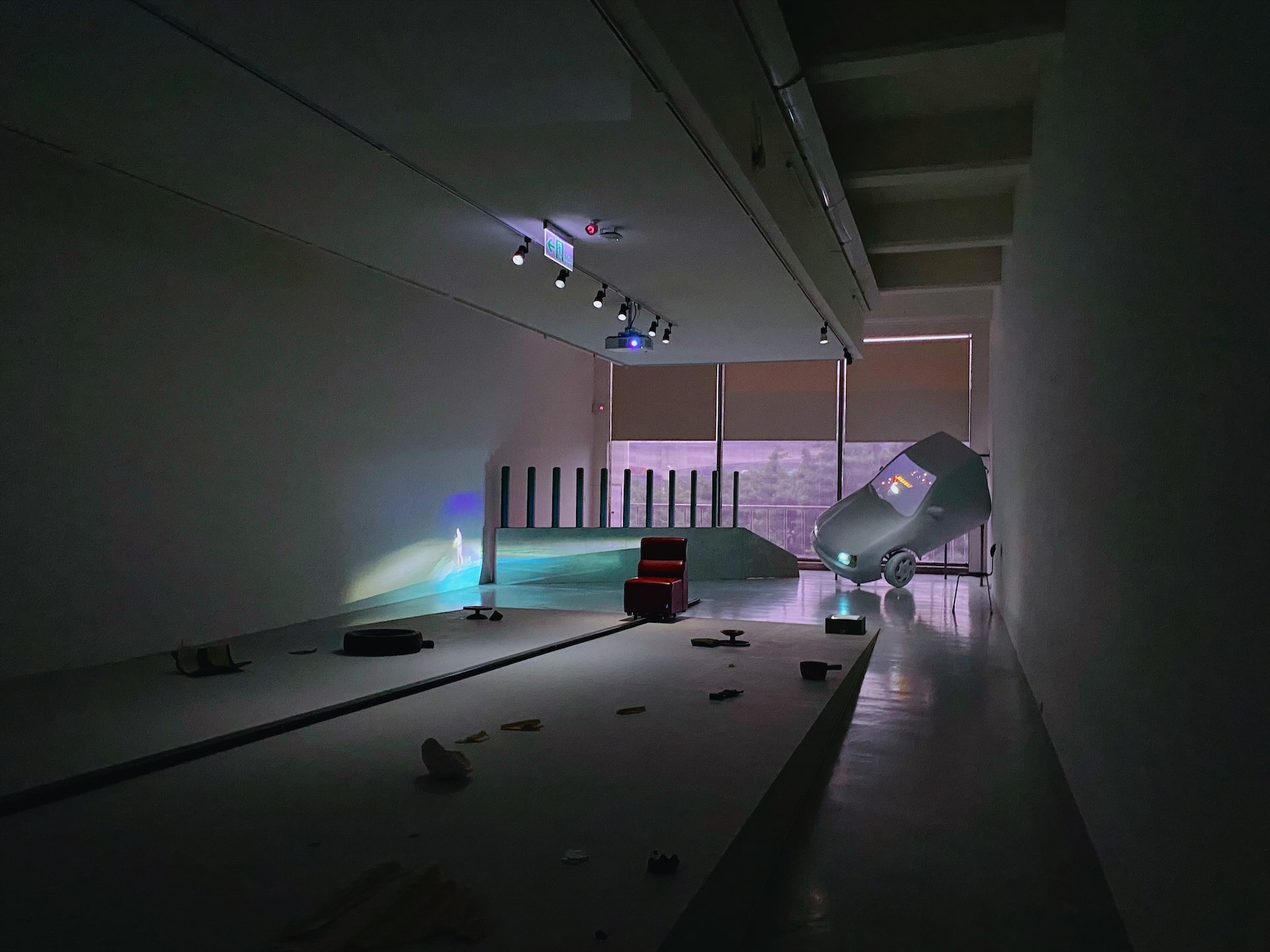 林政佑《斜度三》,源自藝術家曾於斜坡上工作室舉辦的展覽,他依循當時的場域特性,融合影像媒體和身體感知呈現三件作品,讓觀者透過傾斜的身體運作,疊合影像的轉換和視野的推移,而當展覽移至美術館,藝術家亦保留過往的空間記憶,以斜度的身體感為基底,再現、探索媒體與身體之間的關聯。