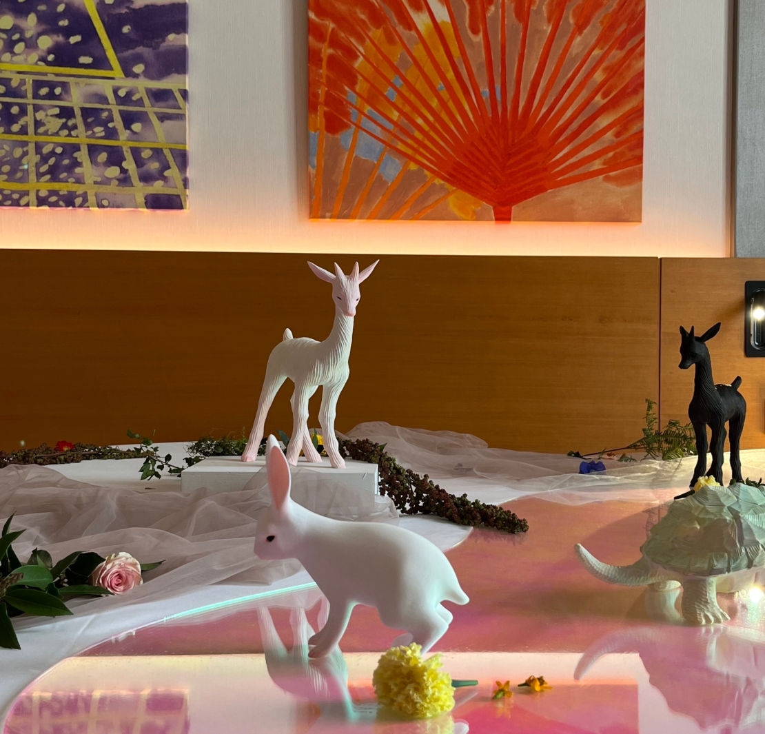此次在空間大小上獨占鰲頭、進駐總統套房的丁丁藝術空間,帶來了Harry Bunce、Jisbar、Rhys Brown、Moises Yagues、Gabrielle Graessle、Antonio Cugnetto、吉田昭彥、Gemma Holzer等多位國外藝術家的精選作品。Jisbar的大件平面作品成為琳琅滿目的入口,畫廊團隊將內裡的展覽空間搖身為一間時尚概念店。除了他們畫廊主要合作的Moises Yagues帶來了多件與現代藝術使對話的繪畫近作之外,近日甫於畫廊快閃展出個展的英國年輕藝術家Gemma Holzer,於展間也帶來了概念式的展呈,除此之外,在近年獲得許多雕塑收藏家關注的吉田昭彥動物雕塑近作,亦成為長桌上的視覺饗宴。