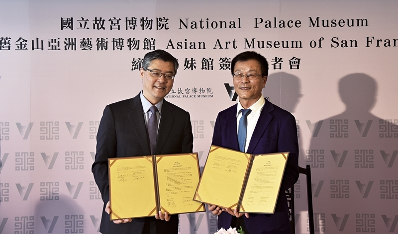 國立故宮博物院院長林正儀(右)、舊金山亞洲藝術博物館館長許傑共同展示合作備忘錄內容。圖/國立故宮博物院。