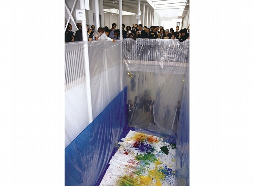 輕井澤新藝術美術館2012年開館,具體派藝術家嶋本昭三(Shozo Shimamoto)於美術館現場進行創作演出,作品為其創作生涯尺幅最大之作,亦是藝術家生前最後一次公開創作演出。(圖/白石畫廊)