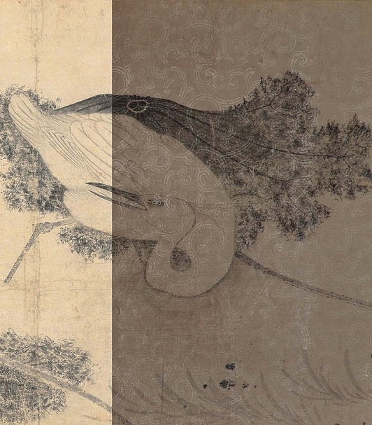 宋徽宗〈池塘秋晚圖卷〉局部,一般肉眼難以辨識紋樣(左),特殊攝影下則可見卷草紋樣(右)。圖/國立故宮博物院,經美術設計處理。