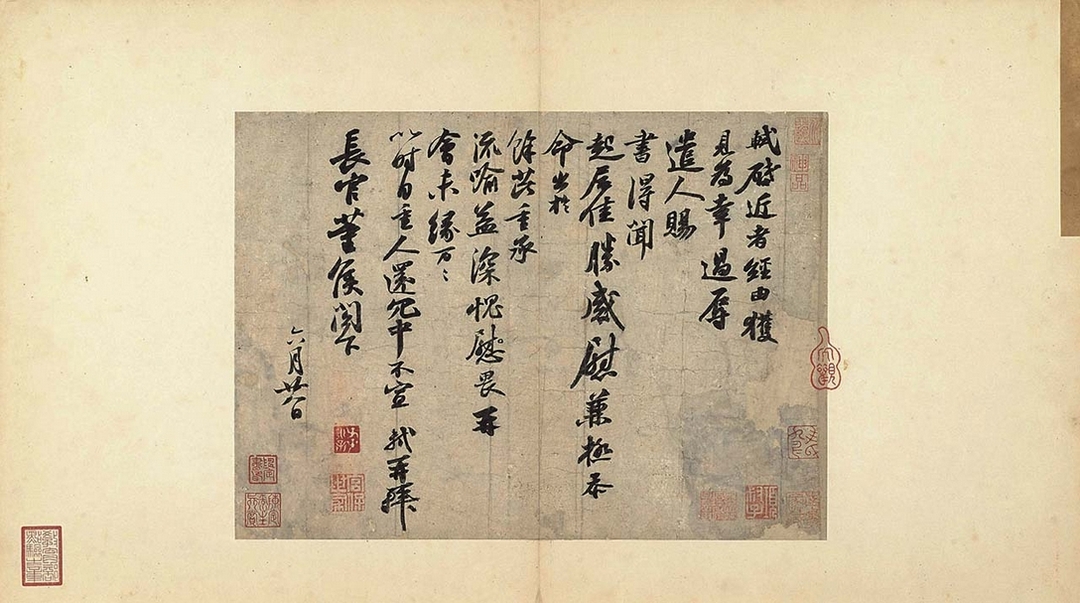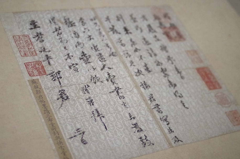 書信是傳統常用的通訊方式,信箋無疑是文人的必備之物。箋紙若經過裝飾,則被稱作「花箋」,花箋不僅增加書寫情趣,同時展現書寫者的藝術品味。在箋紙裝飾手法當中,「砑花」效果最為特殊,其是利用雕板在紙上研壓出紋飾,因而當收信者以指摩娑紙面,即感受到凹凸的花紋。砑花箋紙既保留紙面的淨白,同時卻以美麗豐富的暗紋裝飾,令人愛不釋手。以往學界對砑花箋的研究多集中在明清,然而根據策展人何炎泉十多年來的調查,發現即便故宮的宋人作品收藏數量不多,但竟有20多種不同的砑花箋紙,可見宋人對花箋的喜好,絕不亞於明清二代。當時搭配書信內容,會選擇相應的花箋書寫,如宋蘇軾〈致至孝廷平郭君尺牘〉。蘇軾選用滿飾龜甲紋的粉箋,便是思及古代龜形墓誌銘上飾有龜甲紋,因此透過切合禮節的紋飾,向守喪期間的郭廷平致意。而蘇軾寫給長官的〈書尺牘/致長官董侯尺牘〉,則使用華麗大方的鳳穿牡丹卷草紋,但遺憾的是經由千年歲月,如今信中花紋無法用肉眼辨識。