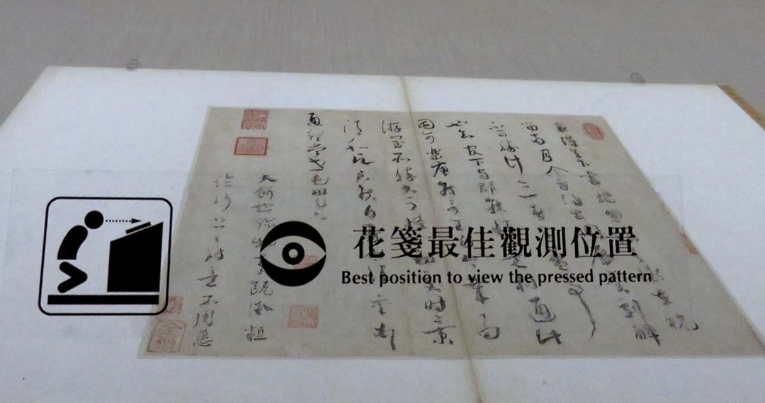 宋人花箋在流傳收藏、多次托裱的情況下,砑花花紋漸漸地變得難以辨識,必須在特定角度才能窺得一二。為了讓這些花紋「重見天日」,故宮這次運用數位拍攝科技及圖像後製技術,令參觀民眾能透過展場布置的示意圖中,看見信箋隱晦的裝飾圖案。在特殊攝影之下,宋徽宗〈池塘秋晚圖卷〉的紋樣終於現身,這卷的砑花粉箋為典雅的卷草紋飾,製作時在紋飾上塗雲母狀的發光物質,最後經過印壓織品紋路的程序後才大功告成。