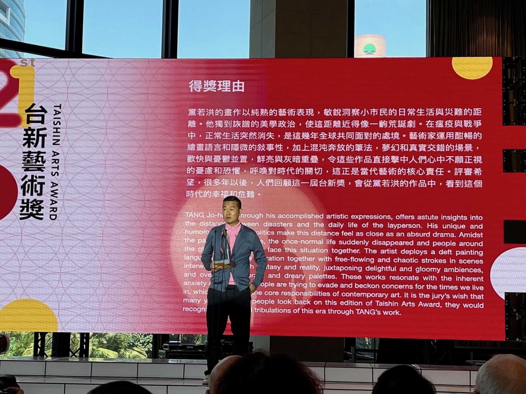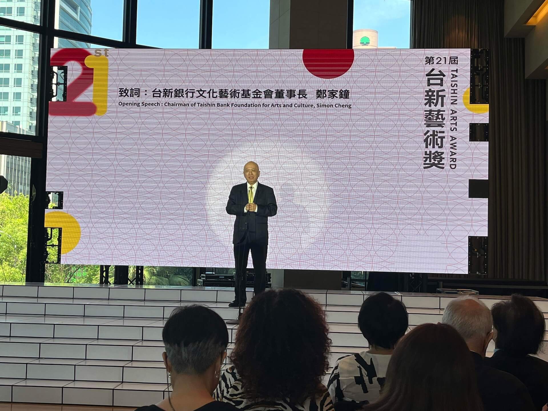 台新銀行文化藝術基金會(以下簡稱「台新文化藝術基金會」)董事長鄭家鐘上台致詞時表示,台新獎自2002年舉辦迄今已21屆,雖然過去三年全球受疫情籠罩,但台新獎依然不曾停辦,甚至於去年(2022)底在北師美術館舉行了「NEXT——台新藝術獎20週年大展」,紀念20週年的重要時刻,展現出台新文化藝術基金會對於推動當代藝術的不遺餘力。而今年的頒獎典禮也是睽違三年首度重新開放嘉賓與會,更是第一次邀請到許多國際貴賓親臨現場觀禮,包含墨西哥、紐西蘭、立陶宛各國的駐華代表。鄭家鐘期待能夠讓所有入圍台新獎的藝術家被國際看見,也希望能透過獎項讓更多人看見在台灣這塊土地上旺盛的藝術能量。