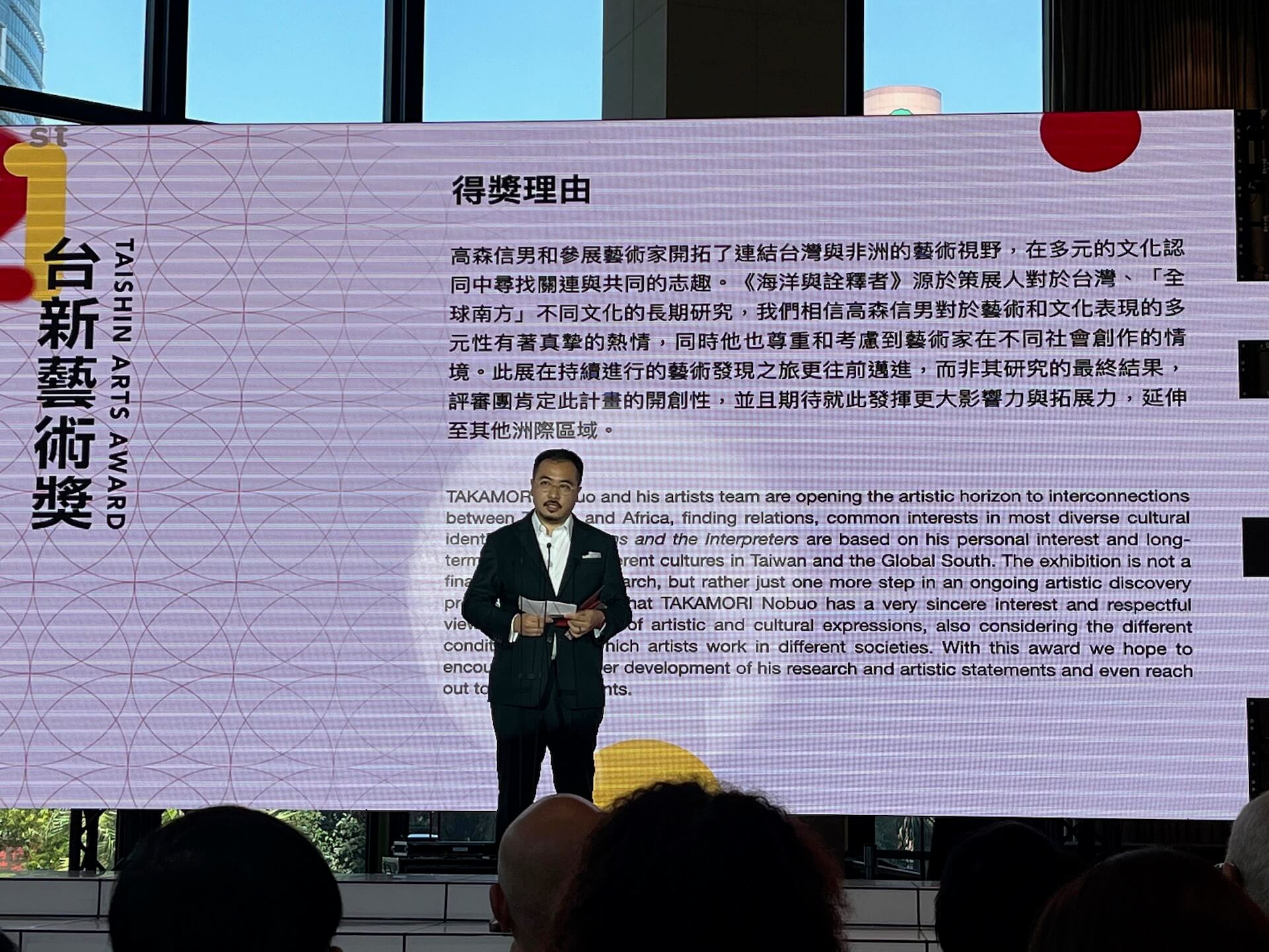 得獎理由:高森信男和參展藝術家開拓了連結台灣與非洲的藝術視野,在多元的文化認同中尋找關聯與共同的志趣。《海洋與詮釋者》源於策展人對於台灣、「全球南方」不同文化的長期研究,我們相信高森信男對於藝術和文化表現的多元性有著真摯的熱情,同時他也尊重和考慮到藝術家在不同社會創作的情境。此展在持續進行的藝術發現之旅更往前邁進,而非其研究的最終結果,評審團肯定此計畫的開創性,並且期待就此發揮更大影像力與拓展力,延伸至其他洲際區域。