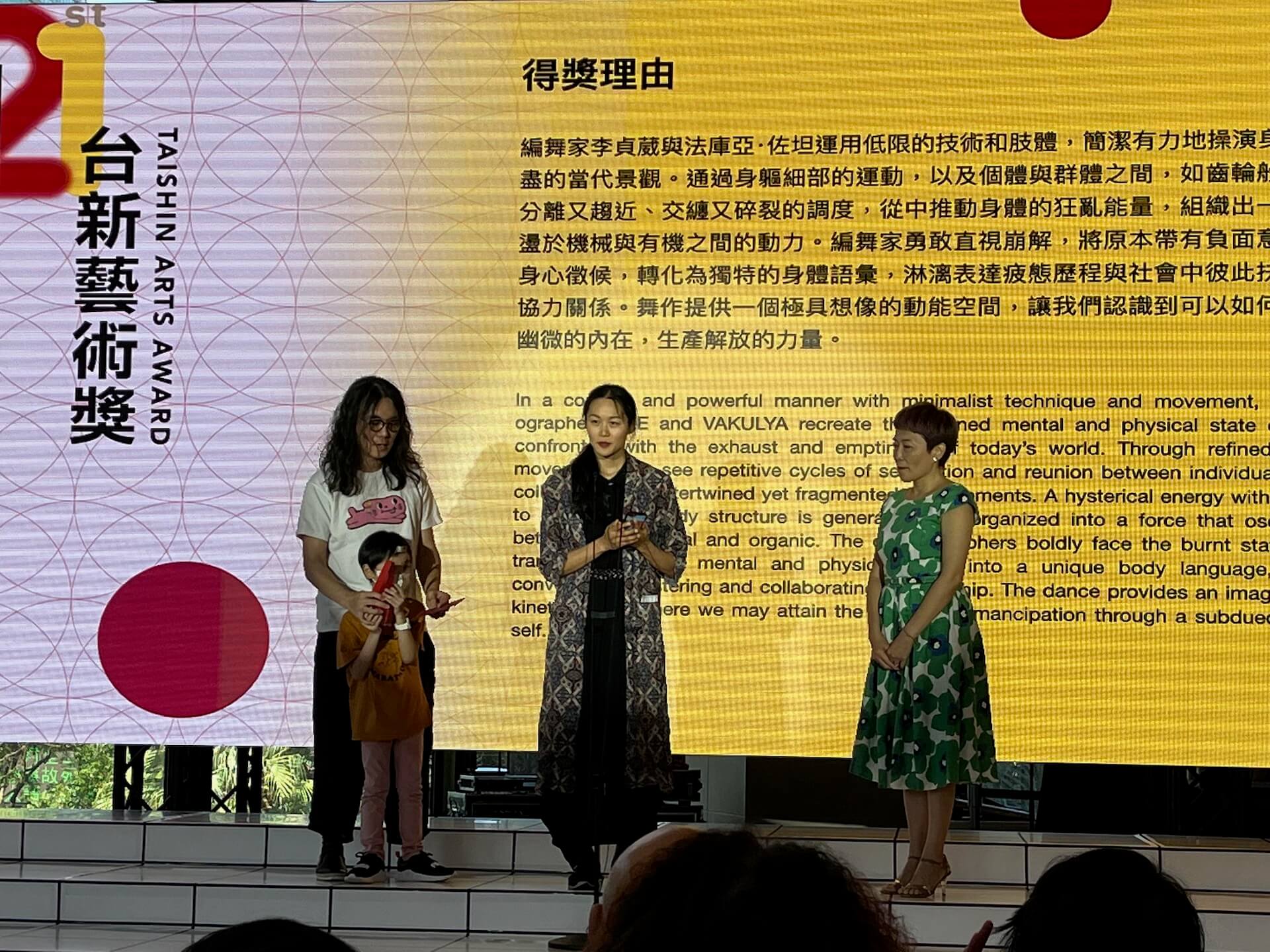 得獎理由:編舞家李貞葳與法庫亞.佐坦運用低限的技術和肢體,簡潔有力地操演身心耗盡的當代景觀。通過身軀細部的運動,以及個體與群體之間,如齒輪般不斷分離又趨近,交纏又碎裂的調度,從中推動身體的狂亂能量,組織出一種擺盪於機械與有機之間的動力。編舞家勇敢直視崩解,將原本帶有負面意涵的身心徵候,轉化為獨特的身體語彙,淋漓表達疲態歷程與社會中彼此扶持的協力關係。舞作提供一個極具想像的動能空間,讓我們認識到可以如何通過幽微的內在,生產解放的力量。