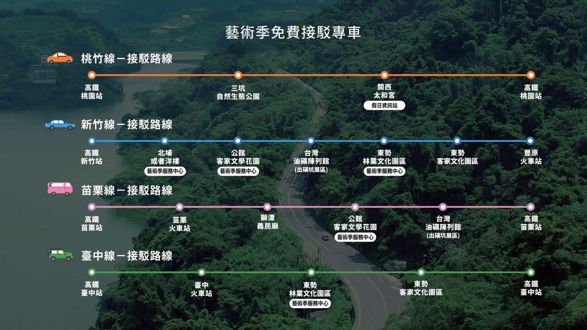 藝術季也與雄獅旅遊合作,安排接駁專車,共有4條線,皆從高鐵站(桃園、新竹、苗栗、台中)出發,帶民眾體驗三大展區的經典作品。另外,雄獅旅遊也推出團體旅遊16條、自由行遊程9條以及12條針對國際入境旅客設計之藝術季遊程,民眾可視需求參與,用自己喜歡的方式,飽覽浪漫台三線迷人的風土景緻。