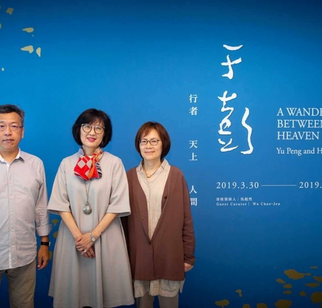 策展人吳超然、北美館館長林平及于彭夫人何醇麗於「于彭:行者·天上·人間」回顧展現場合影。(©台北市立美術館)