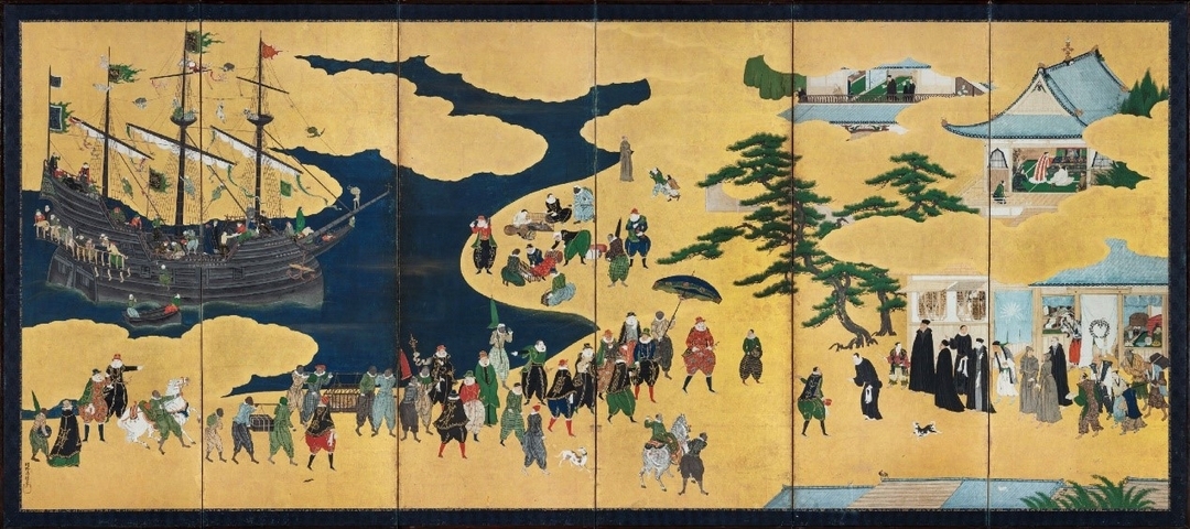 此次展覽亮點,無疑是日本重要文化財、安土桃山時代(16世紀)的《南蠻屏風》。今在日本料理店常見「南蠻」一詞,形容創新不傳統的料理風格,但實際上這詞早於16世紀流行,是日本指稱16世紀從南洋航線北上、高鼻深目的外國人及其傳來的文化。這次神戶市立博物館出借的《南蠻屏風》,運用日本傳統的金地著色形式,畫中描繪外國船隻駛入港中,穿著華服的紳士們陸續下船,身邊還有黑人奴僕跟隨,表現出異國風情之餘,也滿足觀者窺探歐洲生活的好奇心。