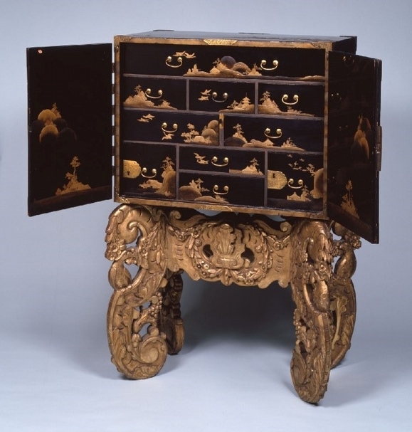 江戸時代(17世紀前期)《蒔繪樓閣山水紋櫥櫃》。 櫥櫃由日本京都製,腳架為歐洲製。(©神戶市立博物館)