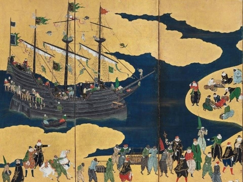 桃山時代狩野內膳《南蠻屏風》,為日本重要文化財。(©神戶市立博物館)
