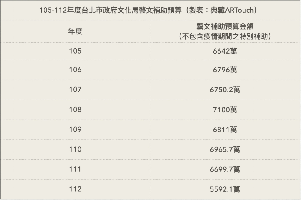 文化局說明,目前正在爭取將下一年度的預算回到過往水準,亦表示樂觀。儘管公部門補助是需要而非必要,整體藝文環境亦應協助降低官方與民間藝文單位對公部門補助的依賴程度,然而,沒有如國藝會「藝企合作」般引導民間資源合作的情況下,在柯市府任期的最後一年,使台北市文化局藝文補助從六字頭降到五字頭,不免讓人擔心,若文化局和主計處以消化疫情延展的結案量能為由而開此一先例,是否會使日後的調整「只降不升」?