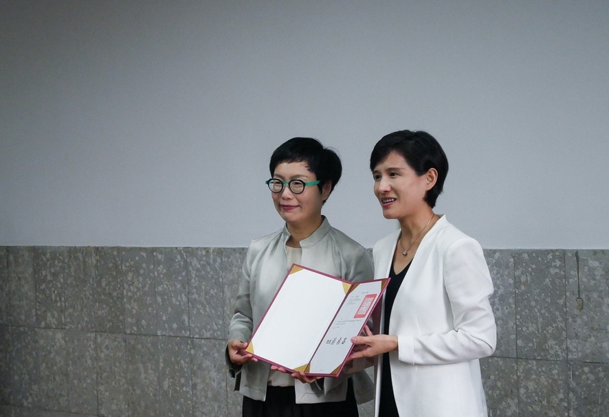 在文策院首次的董事會議上,文化部長鄭麗君(右)頒發民間董監事聘書,圖為第一屆文策院董事長丁曉菁(左)。(攝影/張玉音)