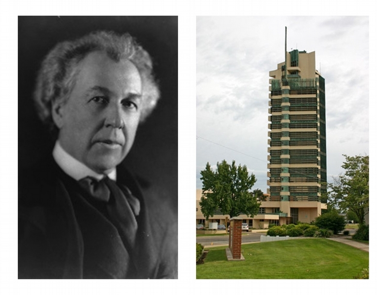 法蘭克.洛伊.萊特(Frank Lloyd Wright)及當時建造的普萊斯大樓(Price Tower)。(©美國國會圖書館、Emersonbiggins85)