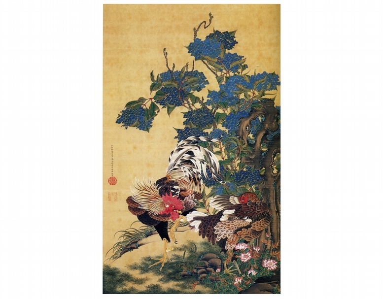 喬.普賴斯收藏之伊藤若沖(Itō Jakuchū)《紫陽花雙鷄圖》。(© Wikipedia)