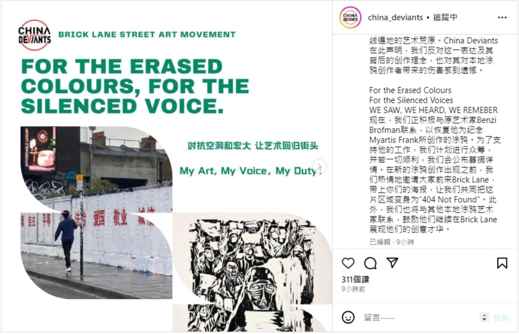 有鑑於此,不少中國海外留學生組織的社群平台,都發起了關注甚至譴責的動態,並企圖修復這個民間的中英關係。「china_deviants」發佈聲明表示,「强烈反对这种形式和目的的艺术创作。在中国国内,许多艺术家和行动者正面临来自政府的压迫和审查,无数的画作和文章消失在互联网上,剩下的只有“404”。」、「现在,我们正积极与原艺术家Benzi Brofman联系,以恢复他为纪念Myartis Frank所创作的涂鸦。」