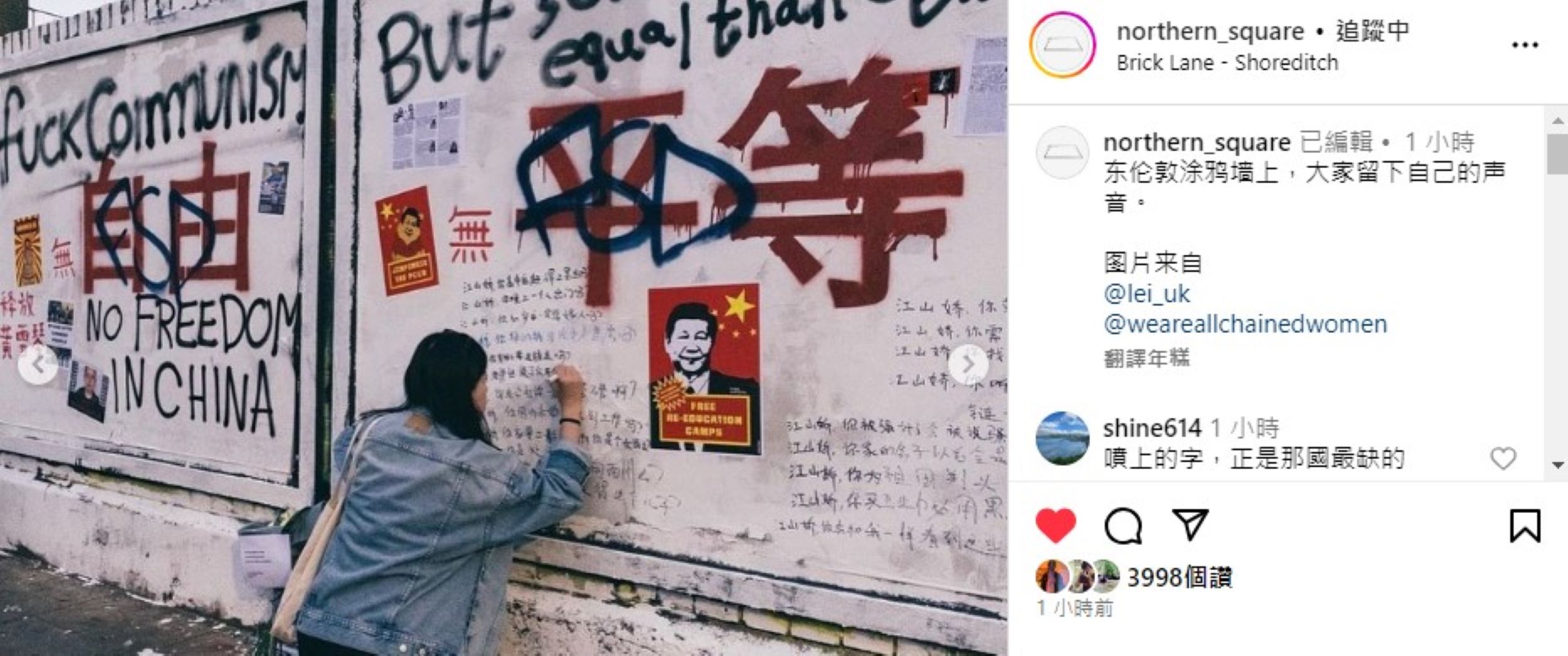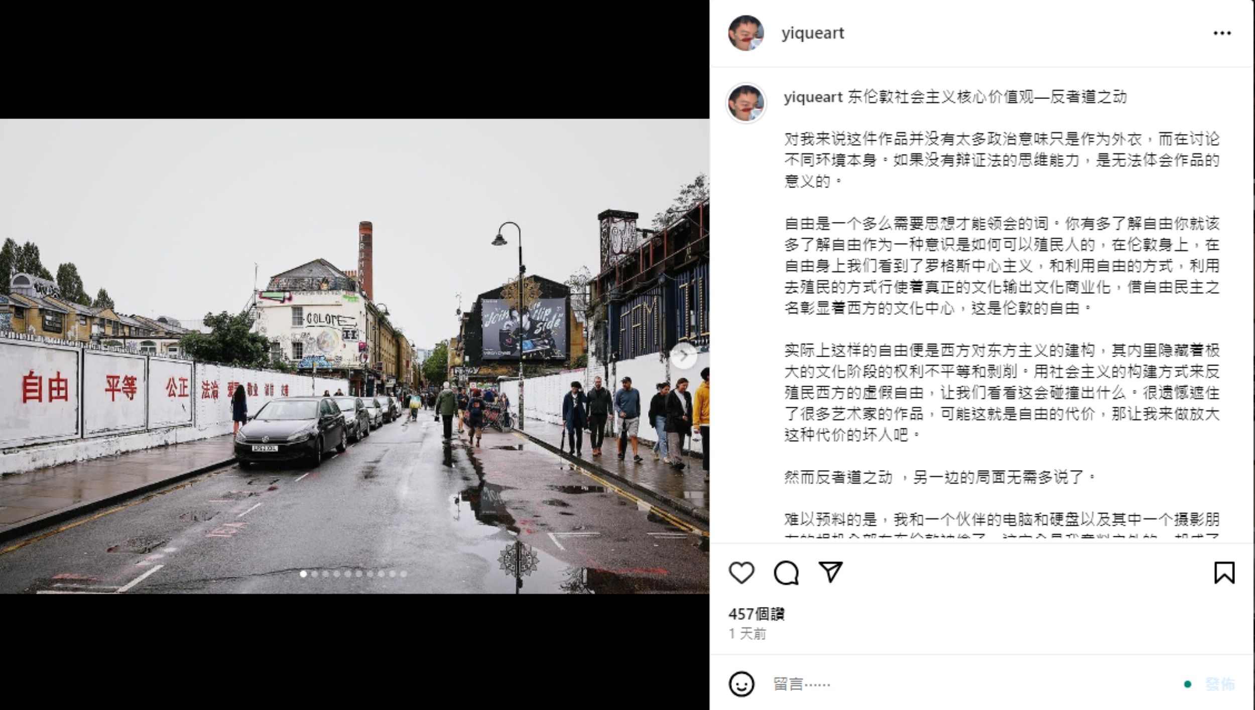 這股怒氣,或許跟他們在英國身為中國留學生的處境有關。在創作者發布自己與夥伴第一創作時間的IG動態裡這麼寫的:「在倫敦身上,在自由身上我們看到了羅格斯中心主義,和利用自由的方式,利用去殖民的方式行使著真正的文化輸出文化商業化,借自由民主之名彰顯著西方的文化中心,這是倫敦的自由。」