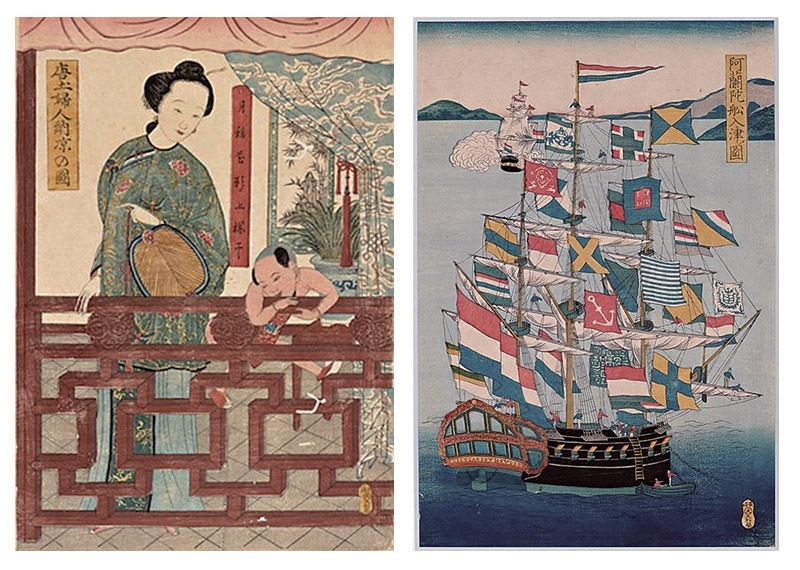 左〈唐土婦人納涼圖〉、右〈阿蘭陀船入津圖〉。