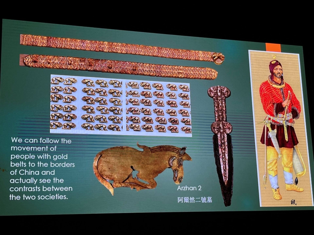 在眾多文物中,羅森近期的研究目光聚焦於黃金腰帶。為什麼是黃金腰帶?出土黃金腰帶上又為何有著圓形的孔洞?羅森指出,「其實一開始中國並沒有黃金腰帶這樣的器物,屬於中國的器物是青銅禮器。」是次唐獎演講主題「青銅禮器與黃金腰帶──中國文化場景的昔與今」,正是她最新的一項研究計畫。羅森強調中國文化的獨立發展特質,指出其與西亞或草原民族文化的不同。