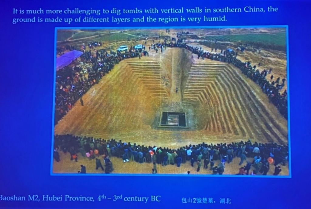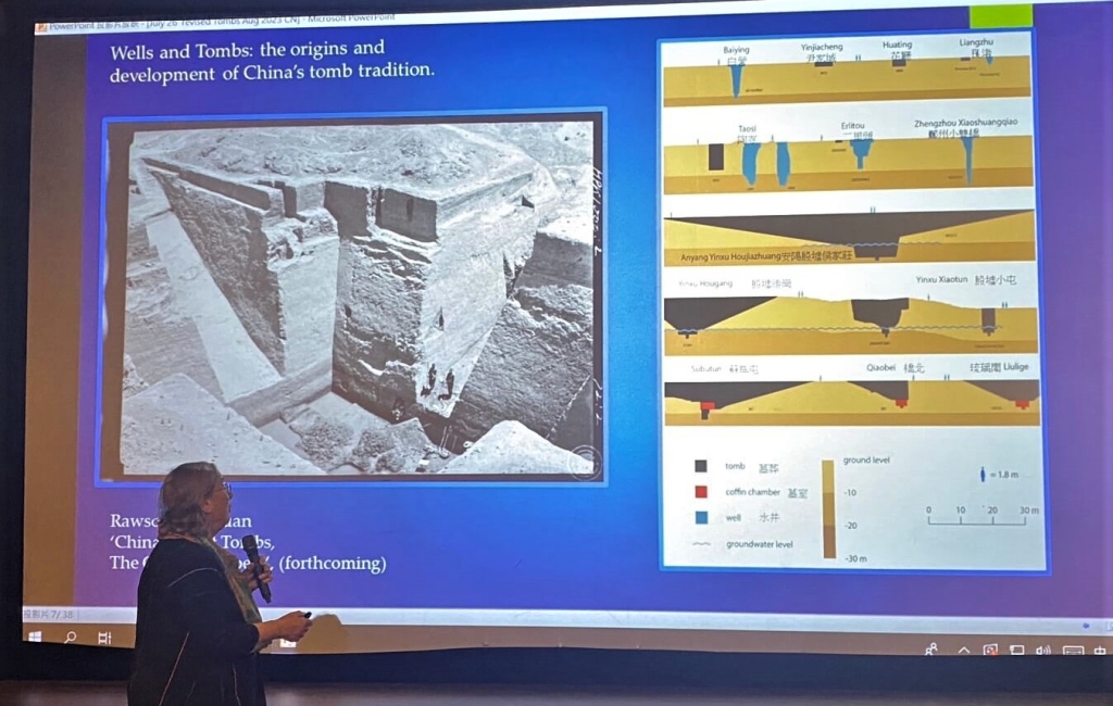 講題「如何看待古代中國大墓中的珍寶」內容出自羅森教授新書Life and Afterlife in Ancient China,講者從殷商至秦代墓葬的「建築結構」與「出土的北方珍寶」兩方向,說明北方與中原文化彼此交流的複雜關係。她透過分析中國古代大墓與地理環境,提出生態系統對文明發展的影響力。解讀出土陪葬物時,不將同一墓葬出土物個別看待,而是以系列、組合式地識別整組陪葬文物的內在邏輯,跳脫傳統藝術史與物質文化研究方法,進而發現屬於「物的語言」(language of objects)。