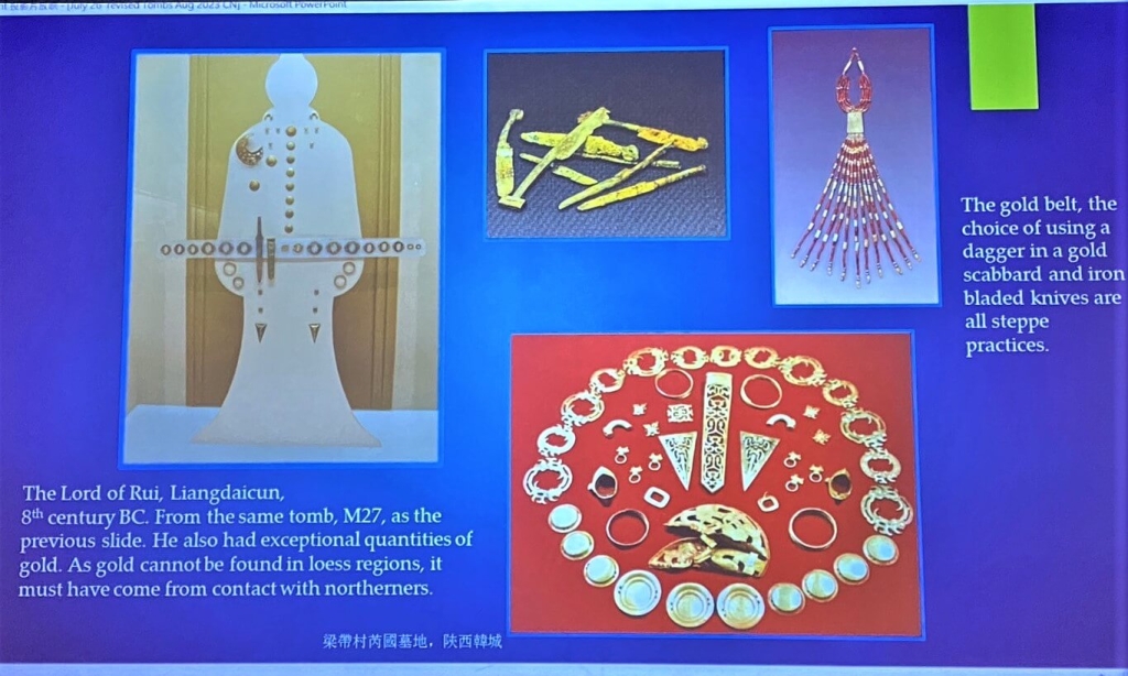她透過出土的青銅禮器和黃金腰帶來介紹上古中國的中原王朝和草原部族這兩個族群截然不同的文化。前者為中國農業經濟、國家、社會和物質文化奠定基礎;後者在北方形成游牧社會,對促成歐亞大陸文化交流厥功甚偉。自公元前1000年起,這兩族群即不斷接觸、競爭,這次演講以此為重要著眼點。羅森教授也進一步比較兩個族群迥異的墓葬形式和對死後世界的信仰,證明環境和氣候對居民生活方式以及社會政治結構的強烈影響。