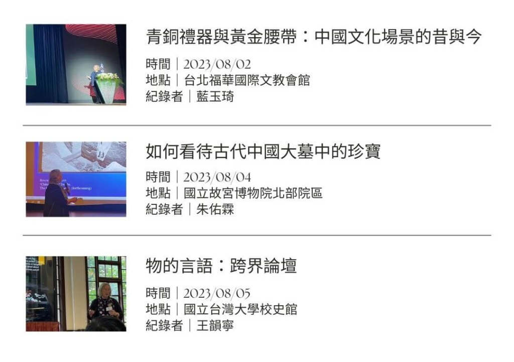 近期(8/1),第五屆唐獎漢學獎得主潔西卡.羅森(Jessica Rawson)來台受獎,並受邀發表三場演說。潔西卡.羅森作為世界級重要中國藝術與考古學者,曾長期任職於大英博物館東方文物部,現任牛津大學中國藝術與考古教授。她致力於促進東西方藝術、文化與學術的交流及認識,具多次實地考古考察經驗,其研究促進全球對中國古代藝術和文化交流的認識有巨大貢獻。她於1990年榮膺為英國國家學術院院士(British Academy),2002年因其在東方研究的貢獻獲英國女王授勳封爵(DBE),2012年獲選為美國藝術與科學院(American Academy of Arts and Sciences)外籍名譽院士,2017年獲頒弗瑞爾獎章(Charles Lang Freer Medal)。2022年獲頒唐獎漢學獎,肯定羅森教授在中國藝術與考古領域的學術成就。