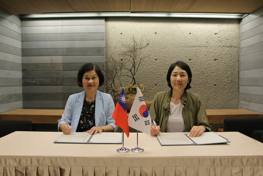 新北市立鶯歌陶瓷博物館館長吳秀慈(左)與韓國金海美術(Clayarch Gimhae Museum)館長崔禎恩(Jeongeun Choi)簽下文化合作協約書,為創館以來簽署的第三個協定。(新北市立鶯歌陶瓷博物館提供)